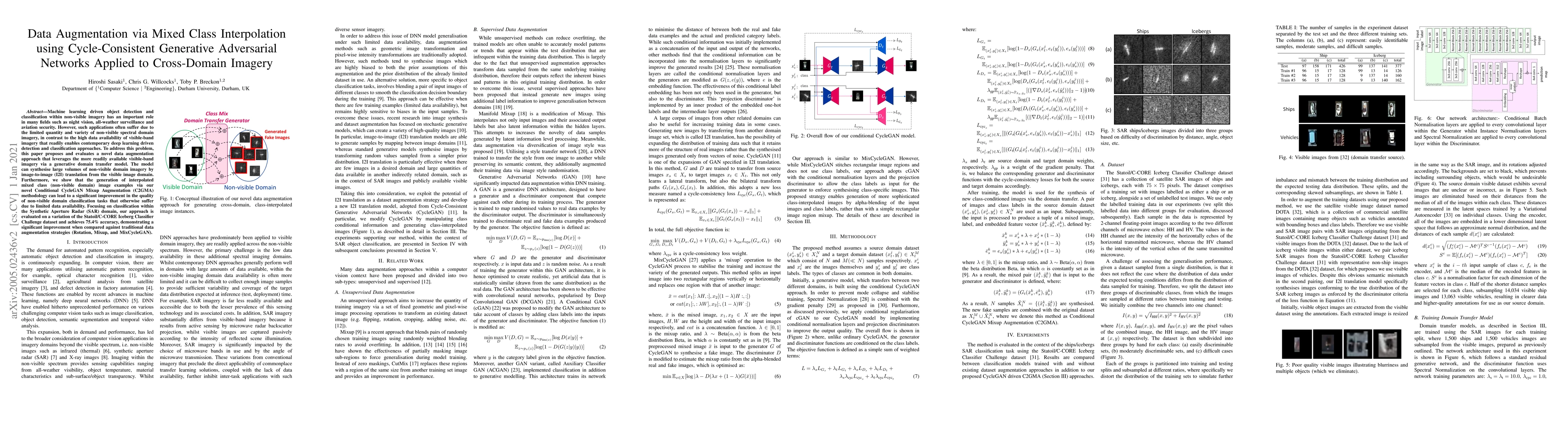 Machine learning driven object detection and classification within non-visible imagery has an important role in many fields such as night vision, all-weather surveillance and aviation security. However, such applications often suffer due to the limited quantity and variety of non-visible spectral domain imagery, in contrast to the high data availability of visible-band imagery that readily enables contemporary deep learning driven detection and classification approaches. To address this problem, this paper proposes and evaluates a novel data augmentation approach that leverages the more readily available visible-band imagery via a generative domain transfer model. The model can synthesise large volumes of non-visible domain imagery by image-to-image (I2I) translation from the visible image domain. Furthermore, we show that the generation of interpolated mixed class (non-visible domain) image examples via our novel Conditional CycleGAN Mixup Augmentation (C2GMA) methodology can lead to a significant improvement in the quality of non-visible domain classification tasks that otherwise suffer due to limited data availability. Focusing on classification within the Synthetic Aperture Radar (SAR) domain, our approach is evaluated on a variation of the Statoil/C-CORE Iceberg Classifier Challenge dataset and achieves 75.4% accuracy, demonstrating a significant improvement when compared against traditional data augmentation strategies (Rotation, Mixup, and MixCycleGAN).