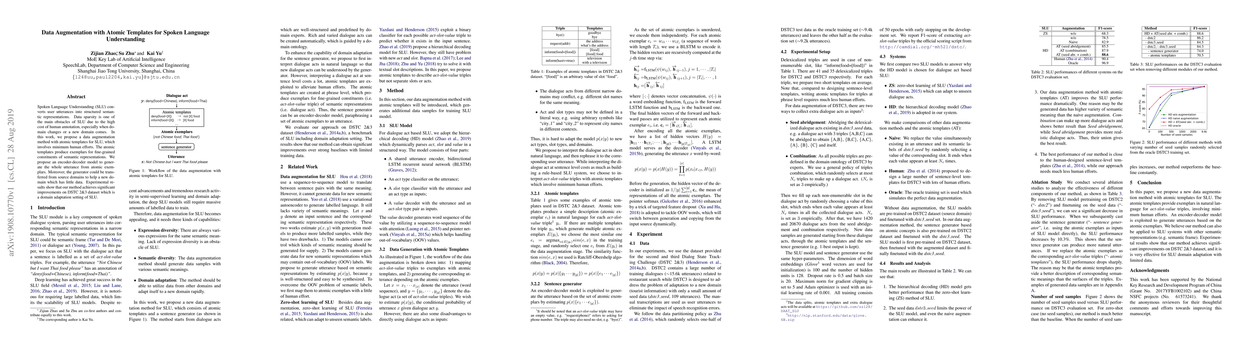 This paper proposes a data augmentation method using atomic templates to address data sparsity in Spoken Language Understanding (SLU). The method generates exemplars for fine-grained semantic constituents and employs an encoder-decoder model to synthesize complete utterances, facilitating domain adaptation with minimal human effort. Experimental results demonstrate significant improvements in domain adaptation settings on the DSTC 2&3 dataset.