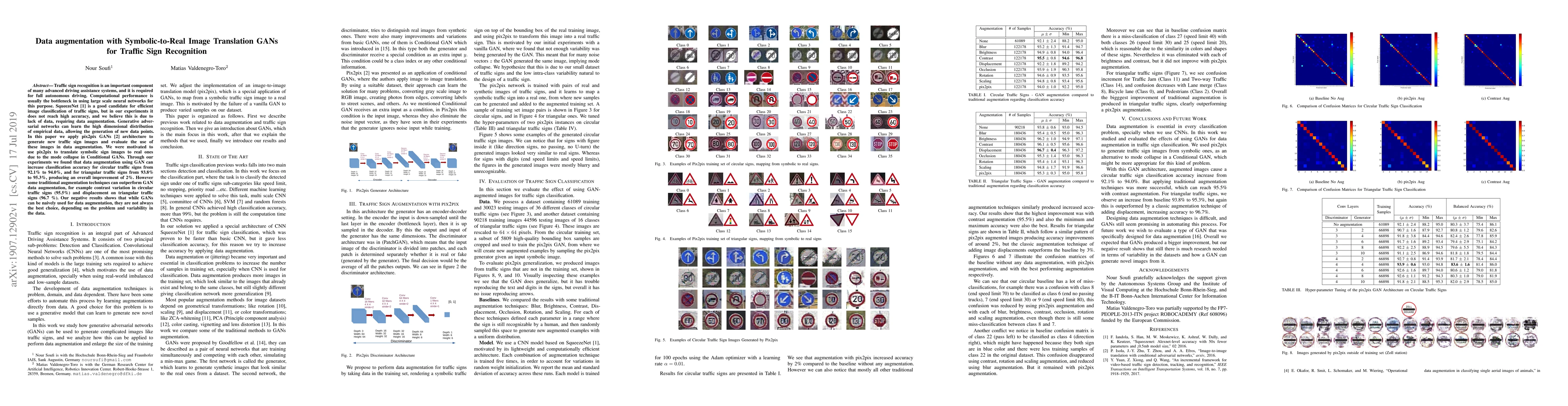 This paper explores using pix2pix GANs for data augmentation to improve traffic sign recognition accuracy using SqueezeNet. Experiments show a 2% overall accuracy improvement, but traditional augmentation methods sometimes outperform GANs, indicating context-dependent effectiveness of GAN data augmentation.