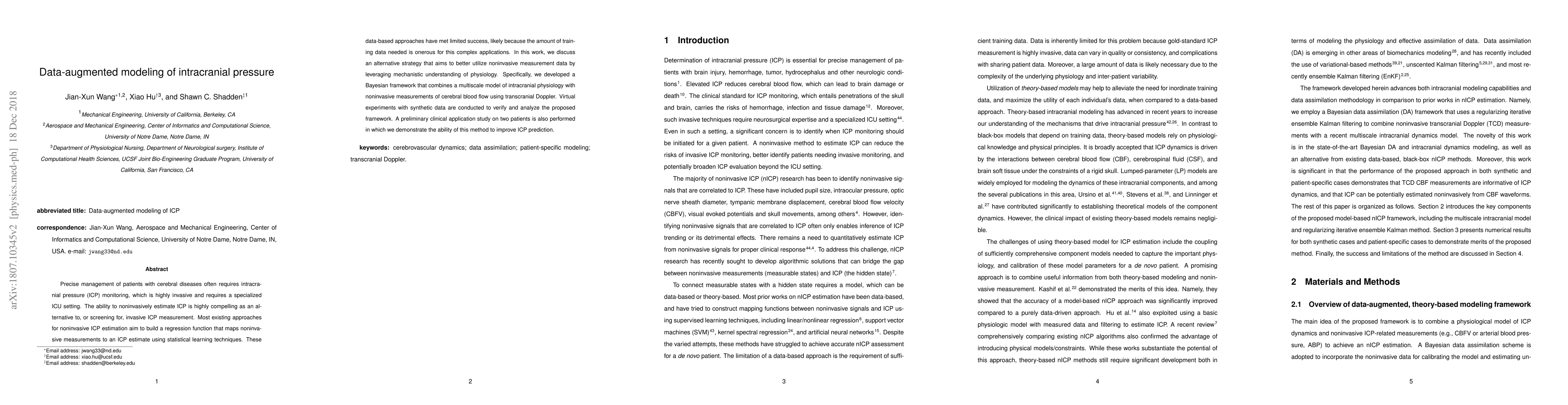 This paper proposes a Bayesian framework combining mechanistic physiological models with noninvasive cerebral blood flow data to estimate intracranial pressure (ICP) noninvasively. Preliminary clinical results show improved ICP prediction compared to existing data-based approaches.