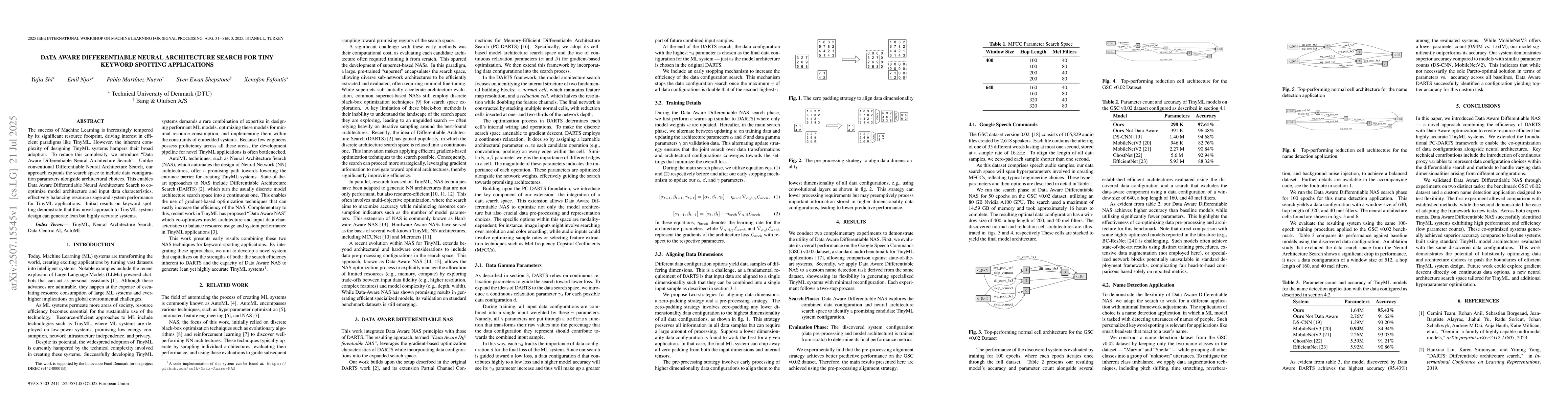 The success of Machine Learning is increasingly tempered by its significant resource footprint, driving interest in efficient paradigms like TinyML. However, the inherent complexity of designing TinyML systems hampers their broad adoption. To reduce this complexity, we introduce "Data Aware Differentiable Neural Architecture Search". Unlike conventional Differentiable Neural Architecture Search, our approach expands the search space to include data configuration parameters alongside architectural choices. This enables Data Aware Differentiable Neural Architecture Search to co-optimize model architecture and input data characteristics, effectively balancing resource usage and system performance for TinyML applications. Initial results on keyword spotting demonstrate that this novel approach to TinyML system design can generate lean but highly accurate systems.