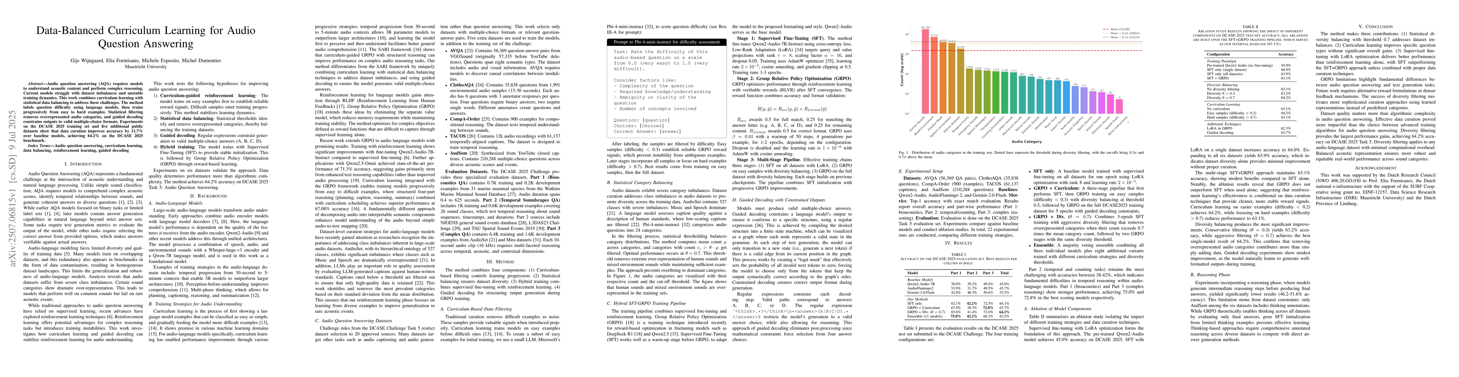 Audio question answering (AQA) requires models to understand acoustic content and perform complex reasoning. Current models struggle with dataset imbalances and unstable training dynamics. This work combines curriculum learning with statistical data balancing to address these challenges. The method labels question difficulty using language models, then trains progressively from easy to hard examples. Statistical filtering removes overrepresented audio categories, and guided decoding constrains outputs to valid multiple-choice formats. Experiments on the DCASE 2025 training set and five additional public datasets show that data curation improves accuracy by 11.7% over baseline models, achieving 64.2% on the DCASE 2025 benchmark.
