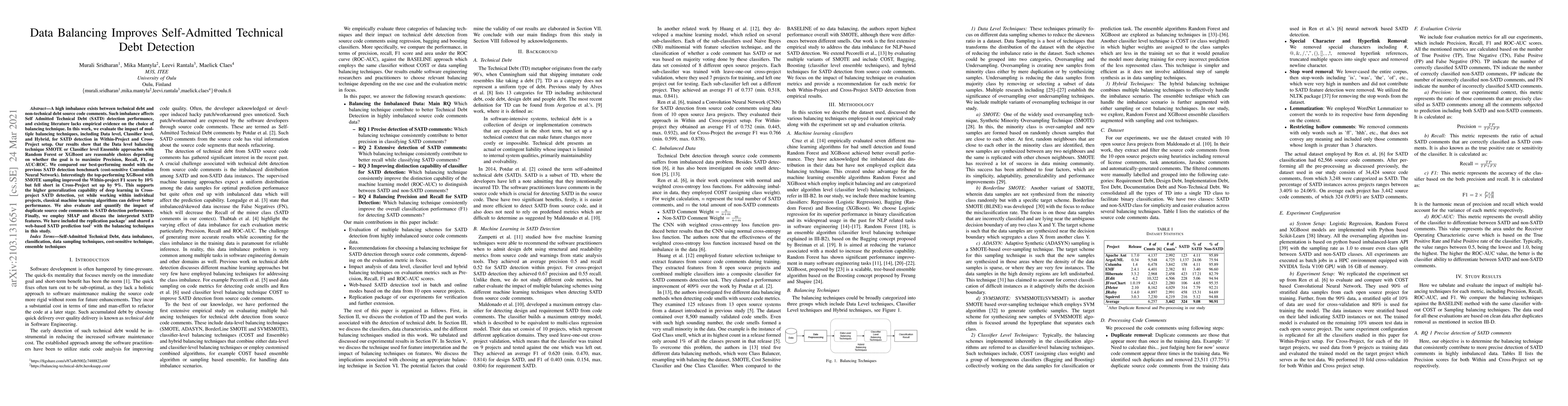 This research evaluates the impact of various data balancing techniques on Self-Admitted Technical Debt (SATD) detection, finding that SMOTE at data level and Random Forest or XGBoost at classifier level perform well. The study reveals that classical machine learning outperforms deep learning within projects, but deep learning shows higher generalization in cross-project detection. It also quantifies the effect of duplicate comments and uses SHAP for feature interpretation, providing a replication package and a web-based SATD prediction tool.