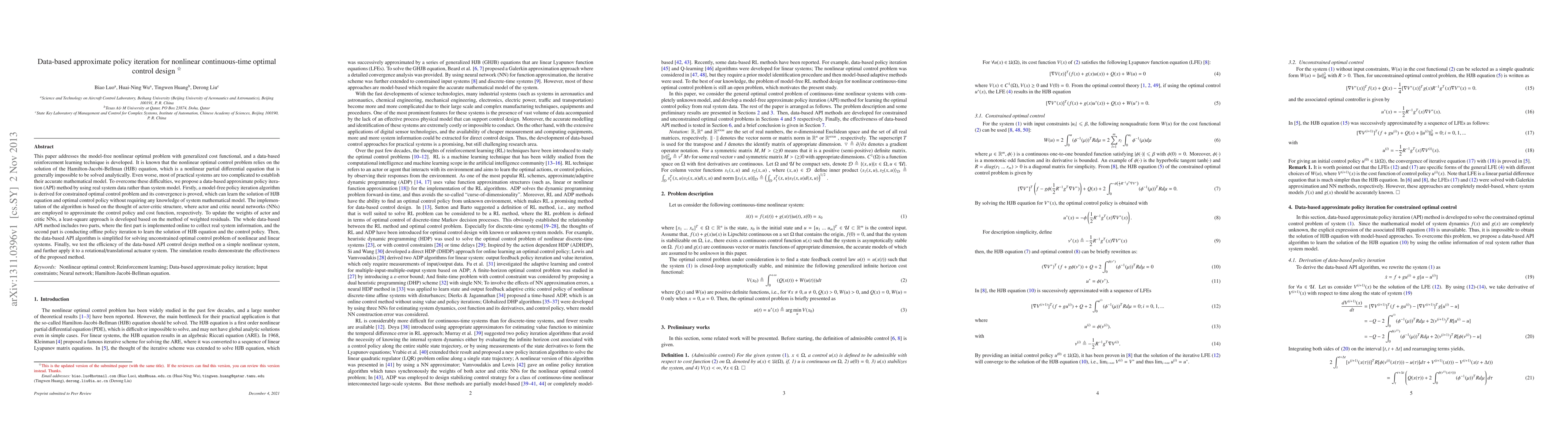 This paper proposes a data-based approximate policy iteration (API) method for solving model-free nonlinear optimal control problems without requiring an accurate mathematical model. The method uses real system data to learn the solution of the Hamilton-Jacobi-Bellman equation and the optimal control policy through an actor-critic neural network structure, demonstrating effectiveness in simulations on nonlinear and actuator systems.