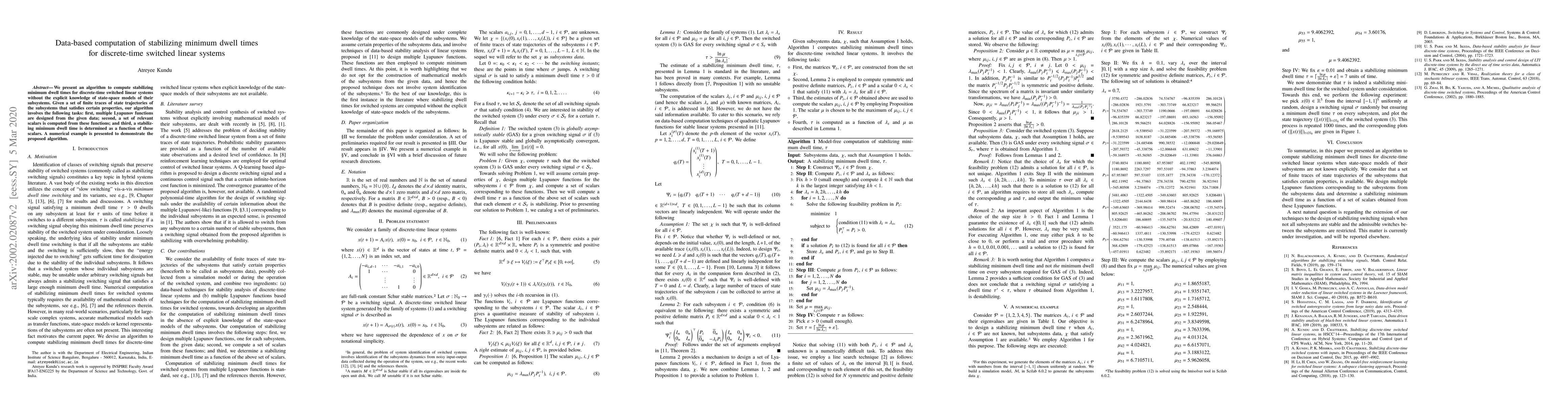 We present an algorithm to compute stabilizing minimum dwell times for discrete-time switched linear systems without the explicit knowledge of state-space models of their subsystems. Given a set of finite traces of state trajectories of the subsystems that satisfies certain properties, our algorithm involves the following tasks: first, multiple Lyapunov functions are designed from the given data; second, a set of relevant scalars is computed from these functions; and third, a stabilizing minimum dwell time is determined as a function of these scalars. A numerical example is presented to demonstrate the proposed algorithm.