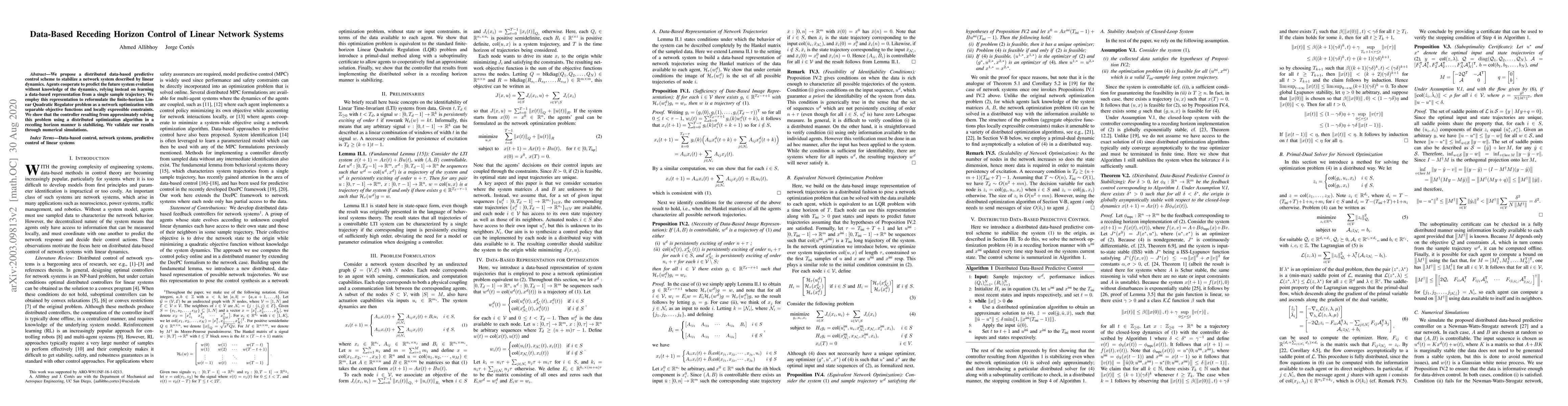 We propose a distributed data-based predictive control scheme to stabilize a network system described by linear dynamics. Agents cooperate to predict the future system evolution without knowledge of the dynamics, relying instead on learning a data-based representation from a single sample trajectory. We employ this representation to reformulate the finite-horizon Linear Quadratic Regulator problem as a network optimization with separable objective functions and locally expressible constraints. We show that the controller resulting from approximately solving this problem using a distributed optimization algorithm in a receding horizon manner is stabilizing. We validate our results through numerical simulations.