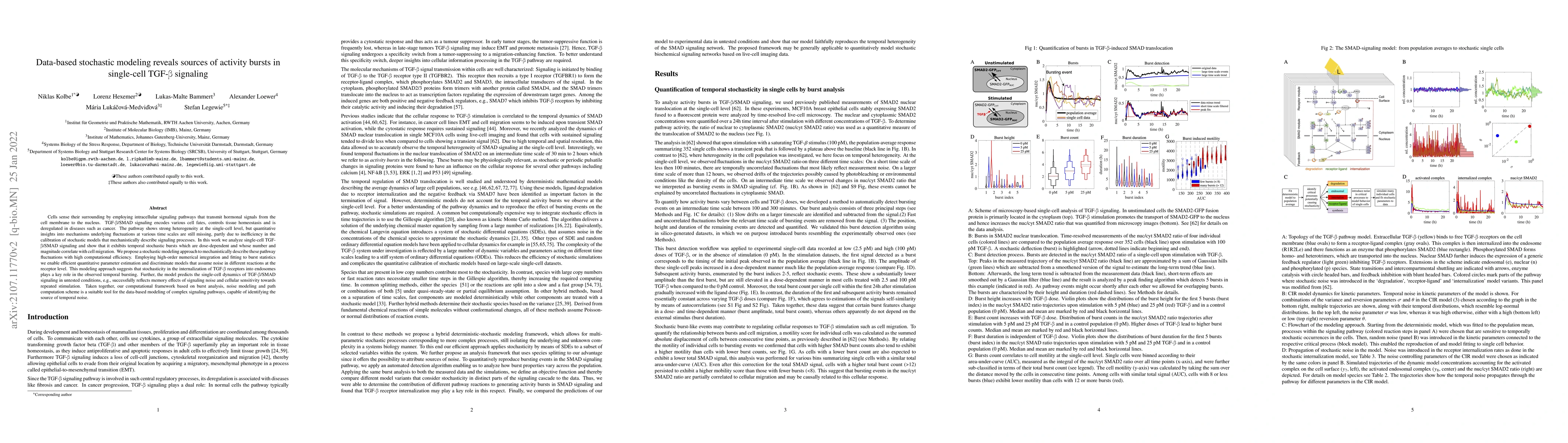 Cells sense their surrounding by employing intracellular signaling pathways that transmit hormonal signals from the cell membrane to the nucleus. TGF-$\beta$/SMAD signaling encodes various cell fates, controls tissue homeostasis and is deregulated in diseases such as cancer. The pathway shows strong heterogeneity at the single-cell level, but quantitative insights into mechanisms underlying fluctuations at various time scales are still missing, partly due to inefficiency in the calibration of stochastic models that mechanistically describe signaling processes. In this work we analyze single-cell TGF-$\beta$/SMAD signaling and show that it exhibits temporal stochastic bursts which are dose-dependent and whose number and magnitude correlate with cell migration. We propose a stochastic modeling approach to mechanistically describe these pathway fluctuations with high computational efficiency. Employing high-order numerical integration and fitting to burst statistics we enable efficient quantitative parameter estimation and discriminate models that assume noise in different reactions at the receptor level. This modeling approach suggests that stochasticity in the internalization of TGF-$\beta$ receptors into endosomes plays a key role in the observed temporal bursting. Further, the model predicts the single-cell dynamics of TGF-$\beta$/SMAD signaling in untested conditions, e.g., successfully reflects memory effects of signaling noise and cellular sensitivity towards repeated stimulation. Taken together, our computational framework based on burst analysis, noise modeling and path computation scheme is a suitable tool for the data-based modeling of complex signaling pathways, capable of identifying the source of temporal noise.