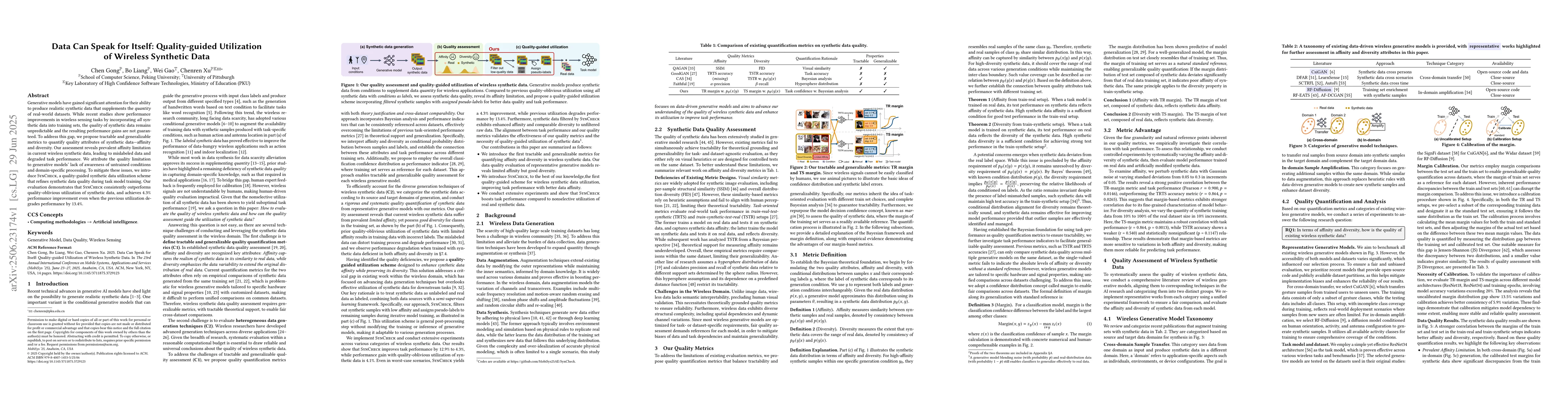 The paper proposes SynCheck, a quality-guided synthetic data utilization scheme for wireless sensing tasks. It identifies prevalent affinity limitations in current synthetic data, causing mislabeled data and decreased performance. SynCheck, which refines synthetic data quality during model training, consistently outperforms quality-oblivious methods, achieving a 4.3% performance improvement even when the latter degrades performance by 13.4%.