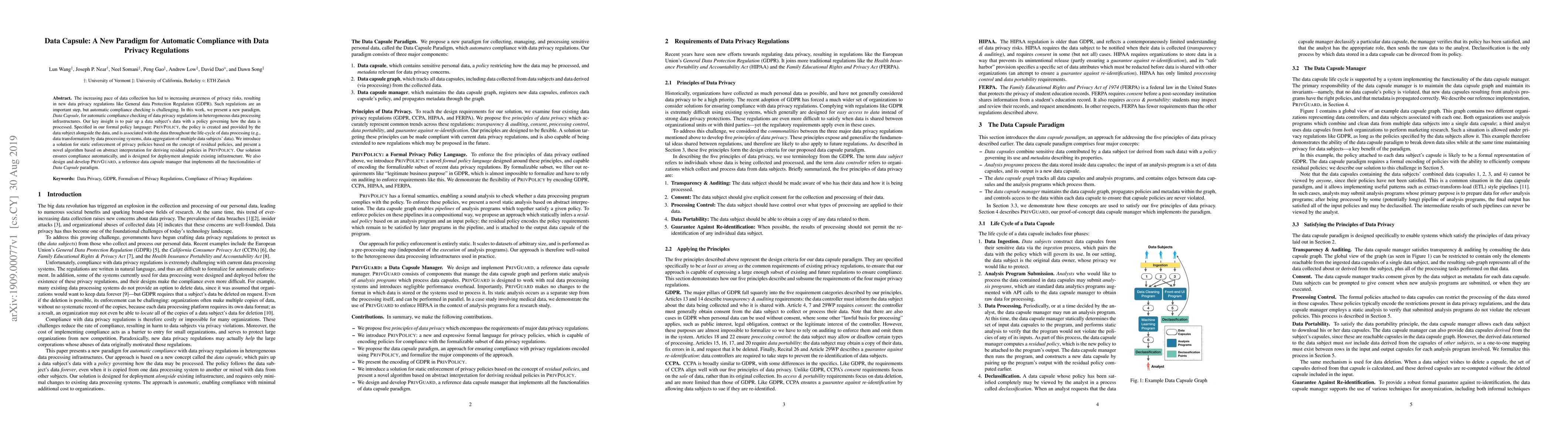 The paper introduces Data Capsule, a new paradigm for automatic compliance with data privacy regulations by embedding a privacy policy, specified in PrivPolicy, alongside the data throughout its processing lifecycle. The solution employs static enforcement and a novel algorithm based on abstract interpretation to ensure compliance, implemented via PrivGuard.
