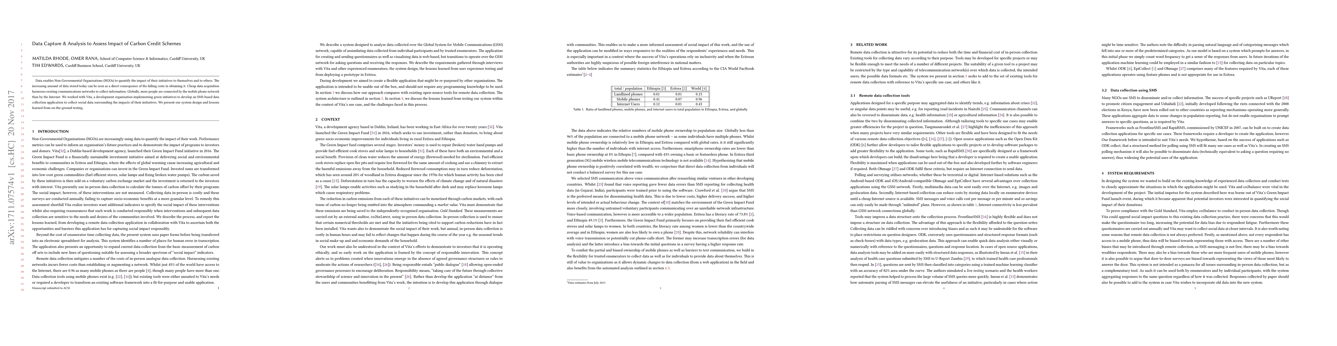 Data enables Non-Governmental Organisations (NGOs) to quantify the impact of their initiatives to themselves and to others. The increasing amount of data stored today can be seen as a direct consequence of the falling costs in obtaining it. Cheap data acquisition harnesses existing communications networks to collect information. Globally, more people are connected by the mobile phone network than by the Internet. We worked with Vita, a development organisation implementing green initiatives to develop an SMS-based data collection application to collect social data surrounding the impacts of their initiatives. We present our system design and lessons learned from on-the-ground testing.