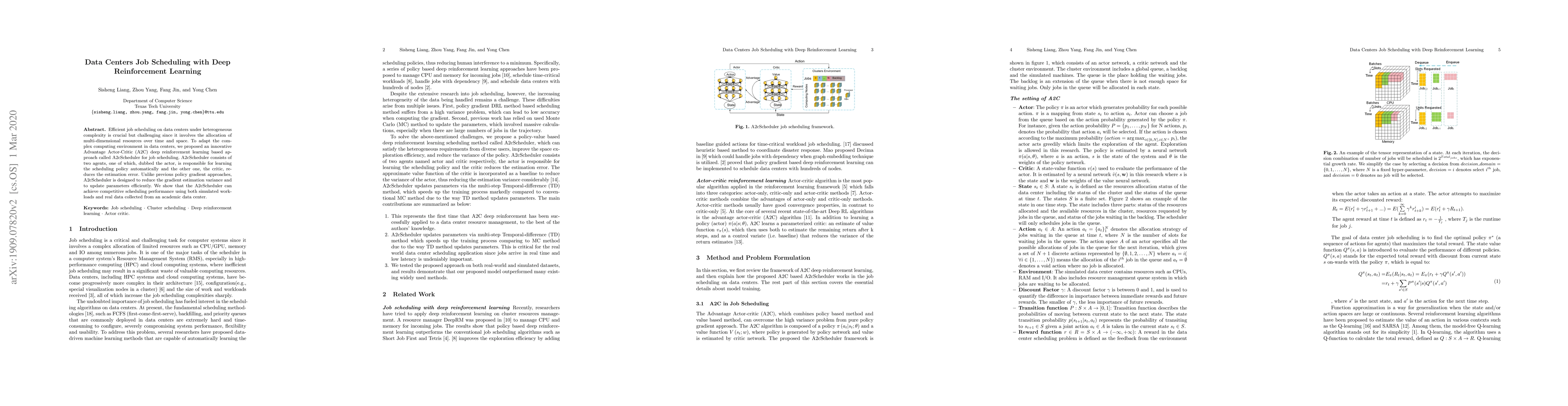 A new approach called A2cScheduler uses deep reinforcement learning to efficiently schedule jobs in data centers, achieving competitive performance with simulated workloads and real-world data.