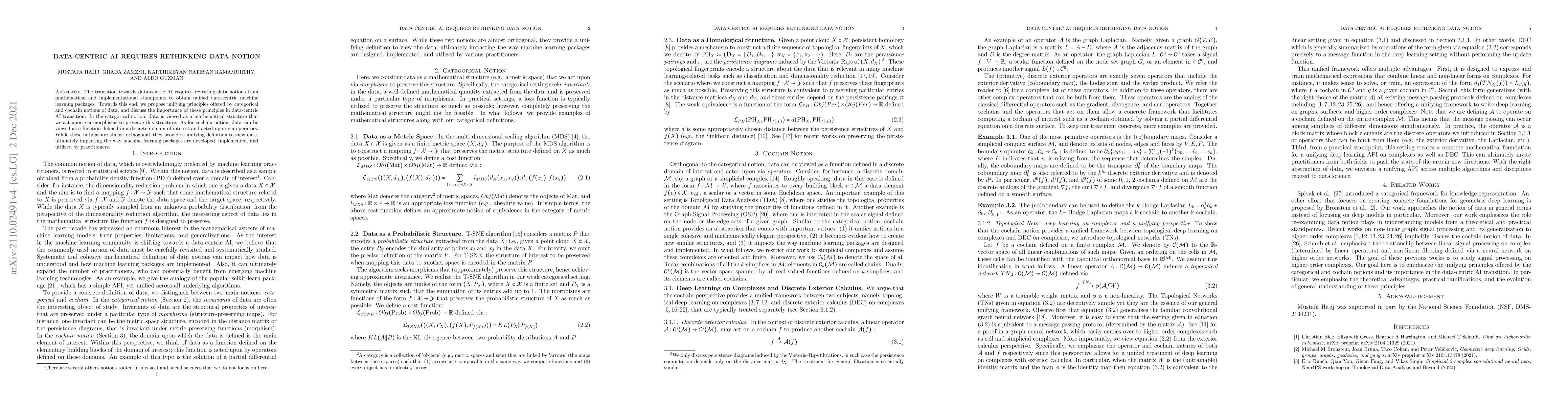 This paper proposes unifying principles from categorical and cochain notions of data to facilitate a transition towards data-centric AI. It emphasizes the importance of these mathematical frameworks for developing cohesive machine learning packages and highlights their impact on data handling and implementation.