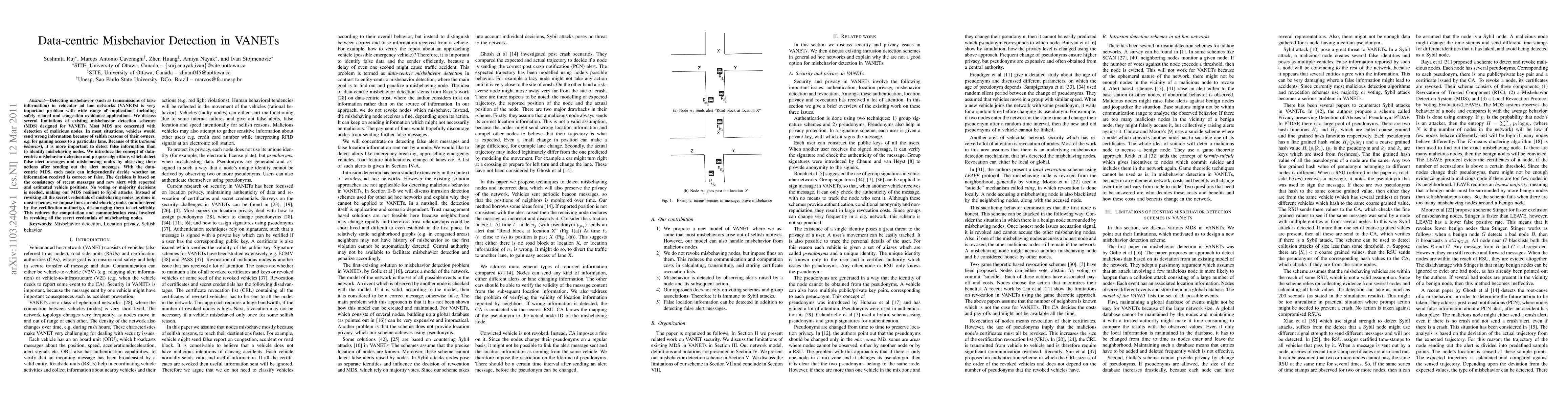This paper proposes a data-centric misbehavior detection scheme for vehicular ad hoc networks (VANETs) to identify false information and misbehaving nodes based on message consistency and vehicle positions, without requiring voting or majority decisions. It imposes fines instead of revoking credentials to reduce computational and communication costs.