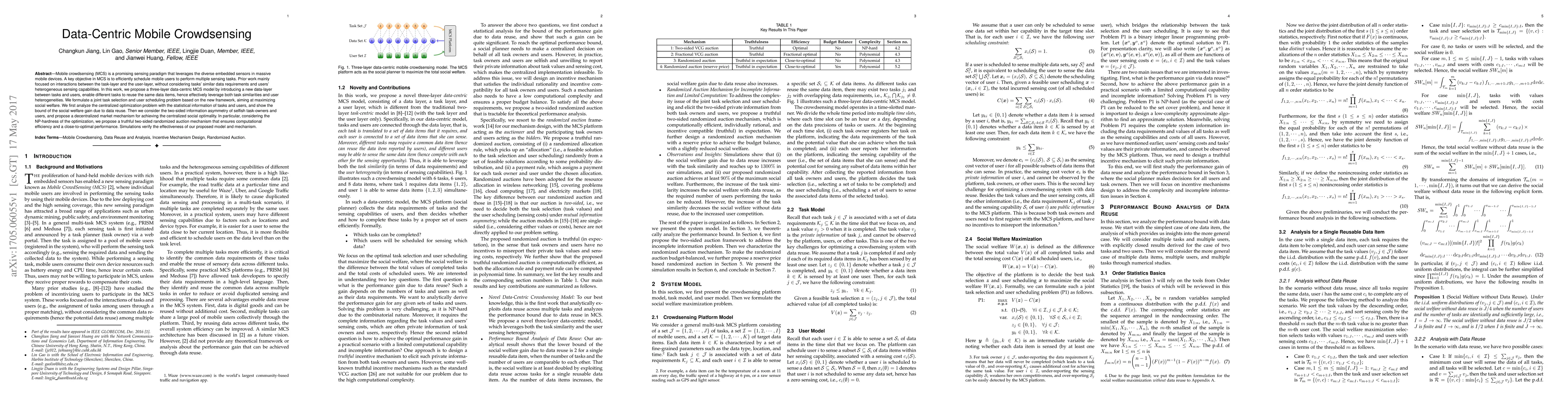 This paper proposes a three-layer data-centric model for mobile crowdsensing to optimize task selection and user scheduling by leveraging data reuse and addressing user heterogeneity. It introduces a decentralized market mechanism to achieve near-optimal social welfare, validated through simulations.
