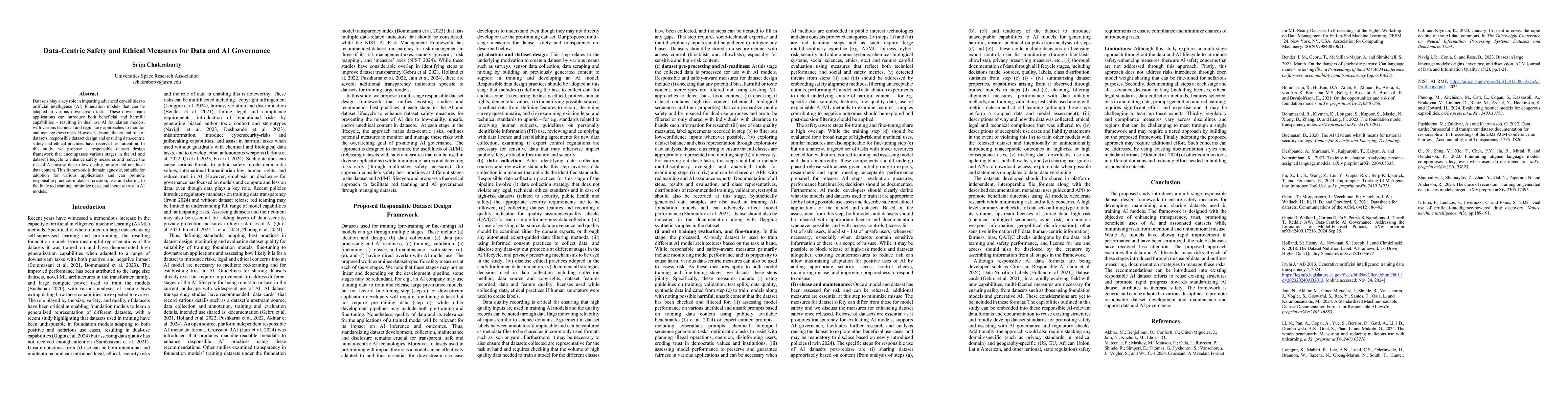 Datasets play a key role in imparting advanced capabilities to artificial intelligence (AI) foundation models that can be adapted to various downstream tasks. These downstream applications can introduce both beneficial and harmful capabilities -- resulting in dual use AI foundation models, with various technical and regulatory approaches to monitor and manage these risks. However, despite the crucial role of datasets, responsible dataset design and ensuring data-centric safety and ethical practices have received less attention. In this study, we pro-pose responsible dataset design framework that encompasses various stages in the AI and dataset lifecycle to enhance safety measures and reduce the risk of AI misuse due to low quality, unsafe and unethical data content. This framework is domain agnostic, suitable for adoption for various applications and can promote responsible practices in dataset creation, use, and sharing to facilitate red teaming, minimize risks, and increase trust in AI models.
