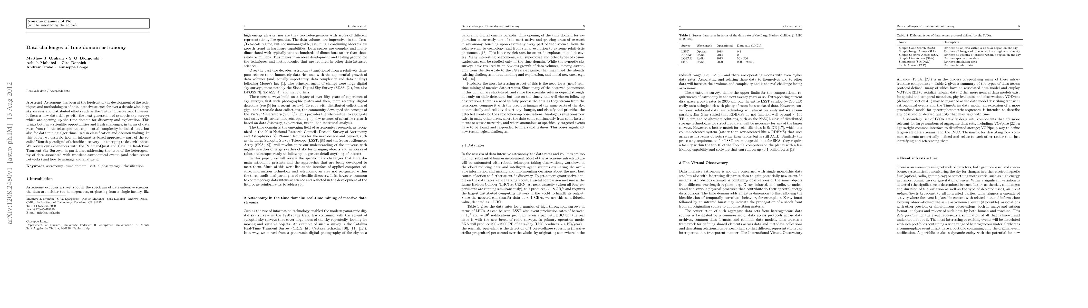 This paper discusses the data challenges posed by the next generation of synoptic sky surveys in time domain astronomy, emphasizing the need for informatics-based approaches to manage the deluge of data from robotic telescopes and the complexity of linked data. It highlights experiences from Palomar-Quest and Catalina Real-Time Transient Sky Surveys, focusing on handling the heterogeneity of data from transient astronomical events.