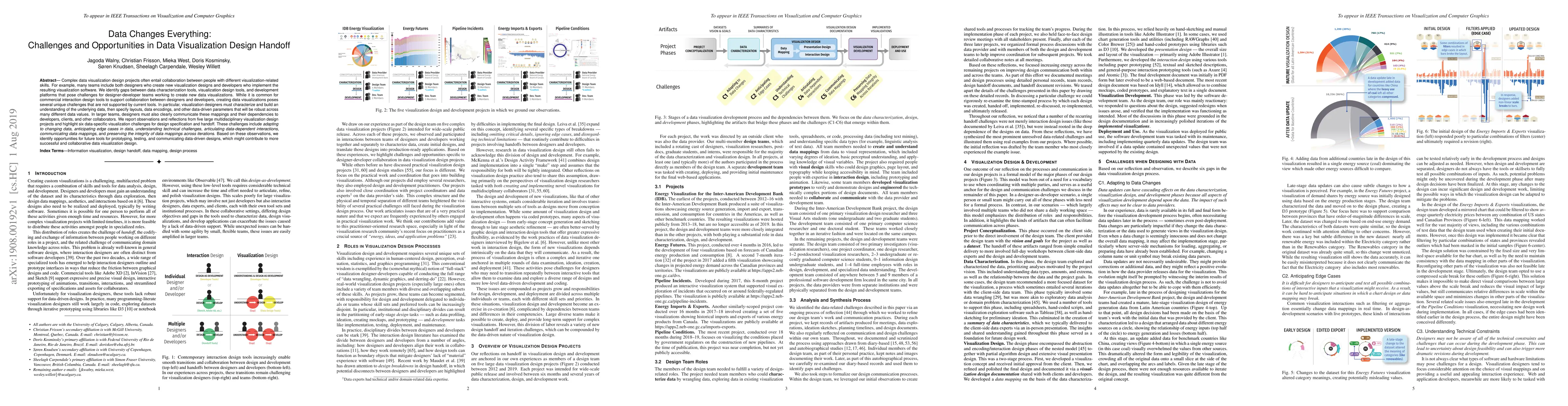 The paper identifies collaboration challenges between designers and developers in complex data visualization projects, emphasizing data-specific issues such as adapting to changing data and communicating data mappings. It proposes opportunities for future tools to enhance prototyping, testing, and collaborative communication for more successful visualization design.