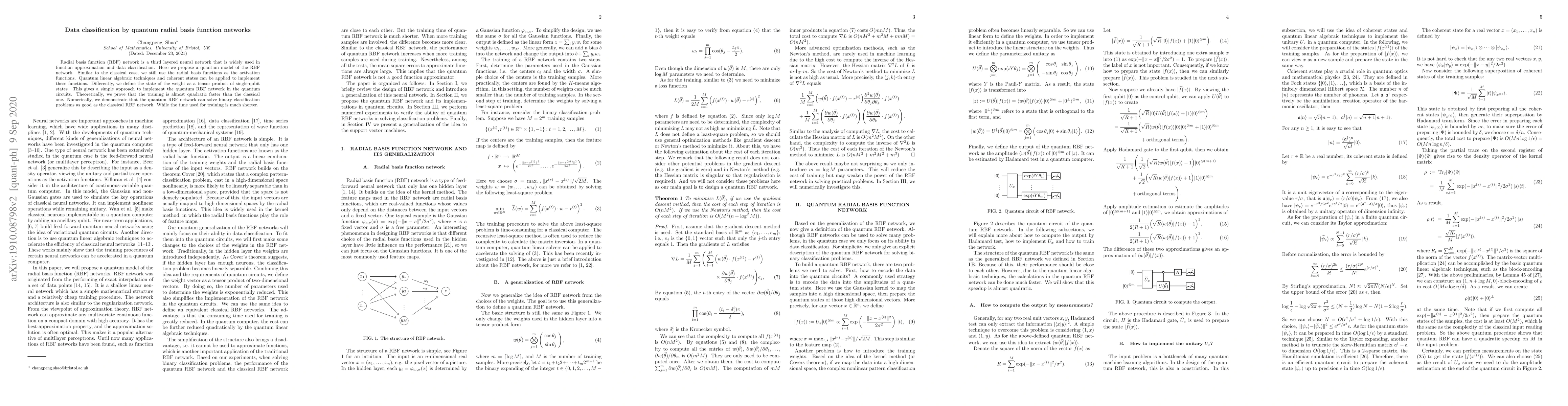 Radial basis function (RBF) network is a third layered neural network that is widely used in function approximation and data classification. Here we propose a quantum model of the RBF network. Similar to the classical case, we still use the radial basis functions as the activation functions. Quantum linear algebraic techniques and coherent states can be applied to implement these functions. Differently, we define the state of the weight as a tensor product of single-qubit states. This gives a simple approach to implement the quantum RBF network in the quantum circuits. Theoretically, we prove that the training is almost quadratic faster than the classical one. Numerically, we demonstrate that the quantum RBF network can solve binary classification problems as good as the classical RBF network. While the time used for training is much shorter.
