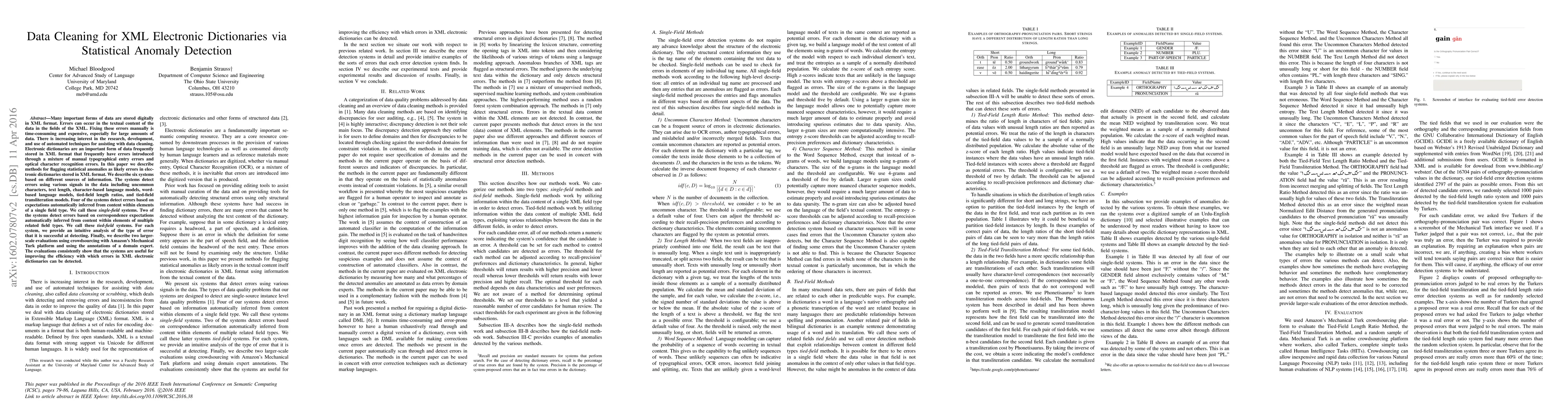 Many important forms of data are stored digitally in XML format. Errors can occur in the textual content of the data in the fields of the XML. Fixing these errors manually is time-consuming and expensive, especially for large amounts of data. There is increasing interest in the research, development, and use of automated techniques for assisting with data cleaning. Electronic dictionaries are an important form of data frequently stored in XML format that frequently have errors introduced through a mixture of manual typographical entry errors and optical character recognition errors. In this paper we describe methods for flagging statistical anomalies as likely errors in electronic dictionaries stored in XML format. We describe six systems based on different sources of information. The systems detect errors using various signals in the data including uncommon characters, text length, character-based language models, word-based language models, tied-field length ratios, and tied-field transliteration models. Four of the systems detect errors based on expectations automatically inferred from content within elements of a single field type. We call these single-field systems. Two of the systems detect errors based on correspondence expectations automatically inferred from content within elements of multiple related field types. We call these tied-field systems. For each system, we provide an intuitive analysis of the type of error that it is successful at detecting. Finally, we describe two larger-scale evaluations using crowdsourcing with Amazon's Mechanical Turk platform and using the annotations of a domain expert. The evaluations consistently show that the systems are useful for improving the efficiency with which errors in XML electronic dictionaries can be detected.