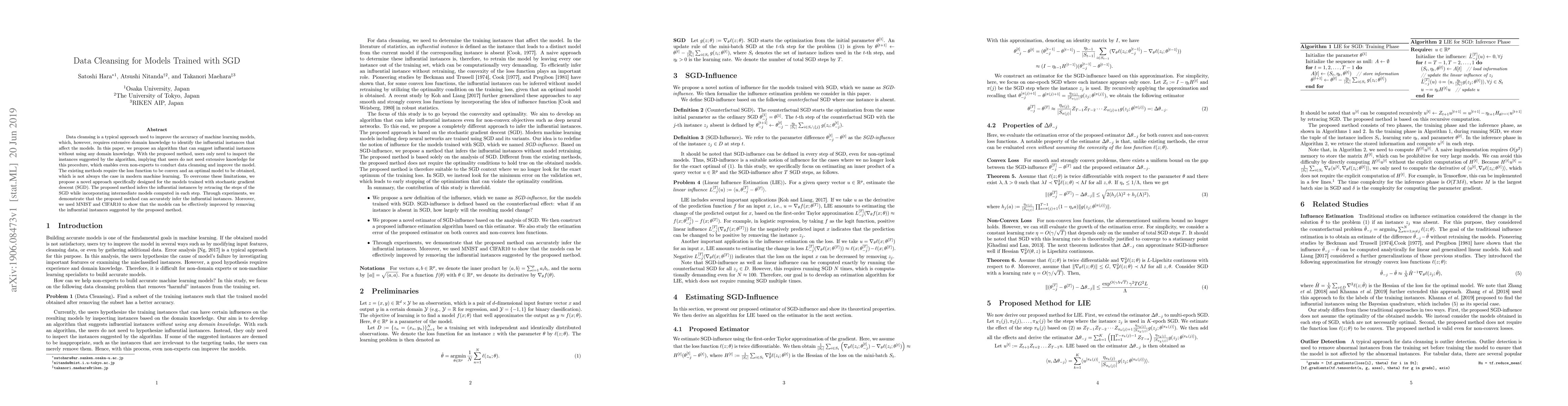 This paper proposes an algorithm to identify influential instances in data cleansing for models trained with stochastic gradient descent (SGD), eliminating the need for extensive domain knowledge. The method infers these instances by retracing SGD steps and demonstrates improved model accuracy on MNIST and CIFAR10 datasets.