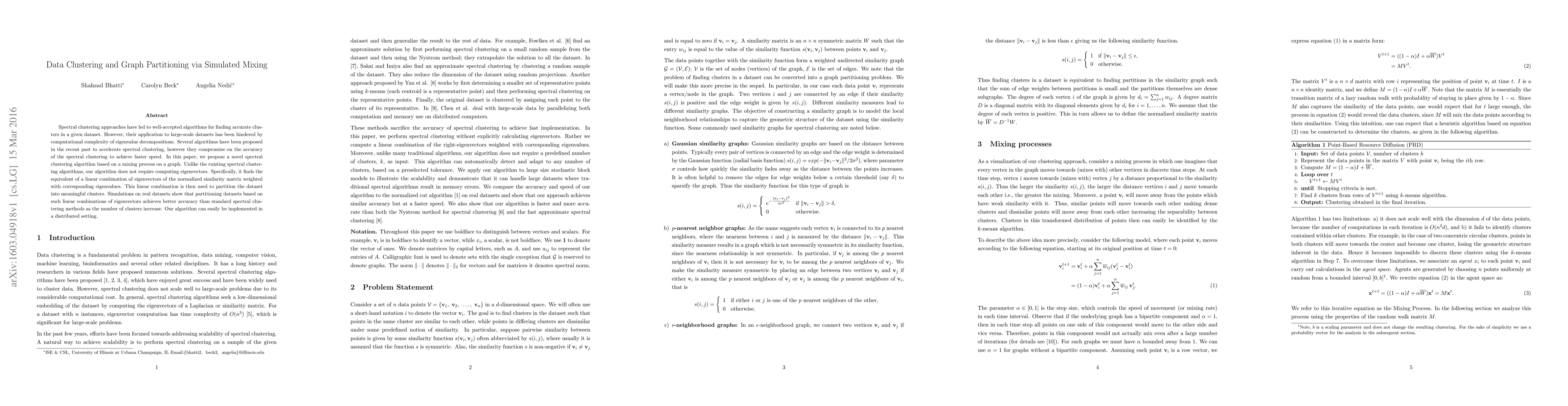 This paper introduces a novel spectral clustering algorithm that leverages a mixing process on a graph to avoid computationally intensive eigenvalue decompositions. Unlike traditional methods, it achieves higher accuracy with increased cluster numbers without requiring eigenvector computation, and is easily implementable in distributed settings.