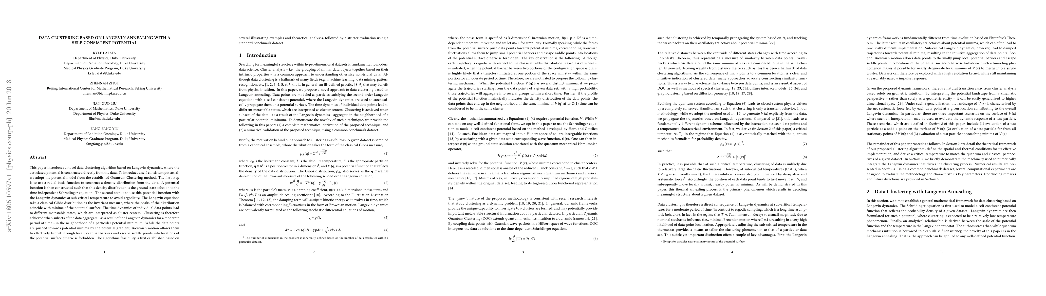 This paper proposes a novel data clustering method using Langevin dynamics with a self-consistent potential derived from the data. The potential is constructed from a density distribution modeled by a radial basis function, enabling the algorithm to identify cluster centers through the dynamics of data points aggregating around potential minima.