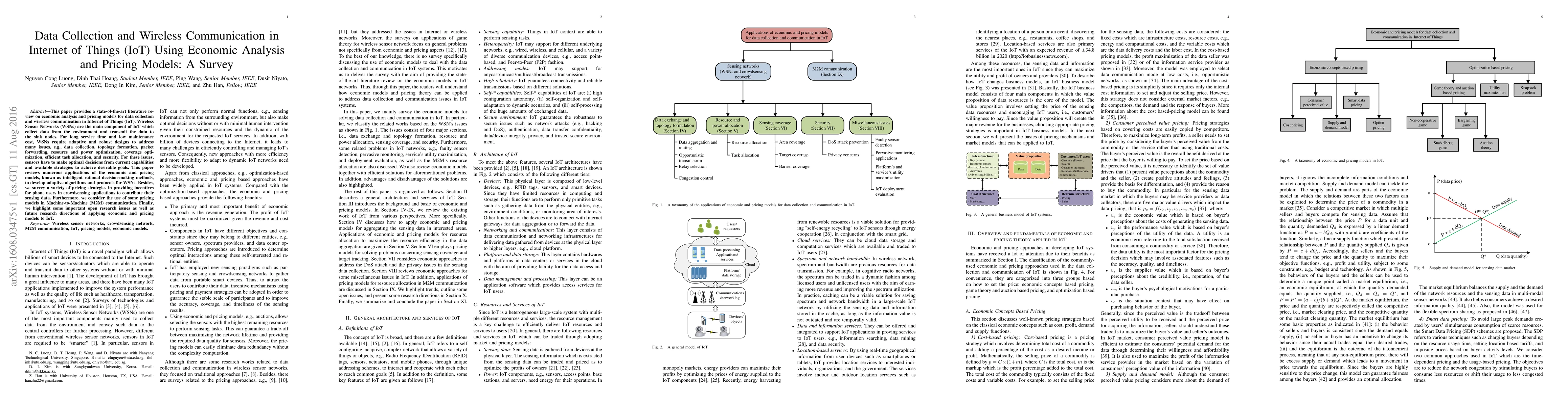 This paper reviews economic analysis and pricing models for optimizing data collection and wireless communication in IoT, focusing on adaptive algorithms for Wireless Sensor Networks and incentives for crowdsensing and M2M communication, while identifying open research challenges and future directions.