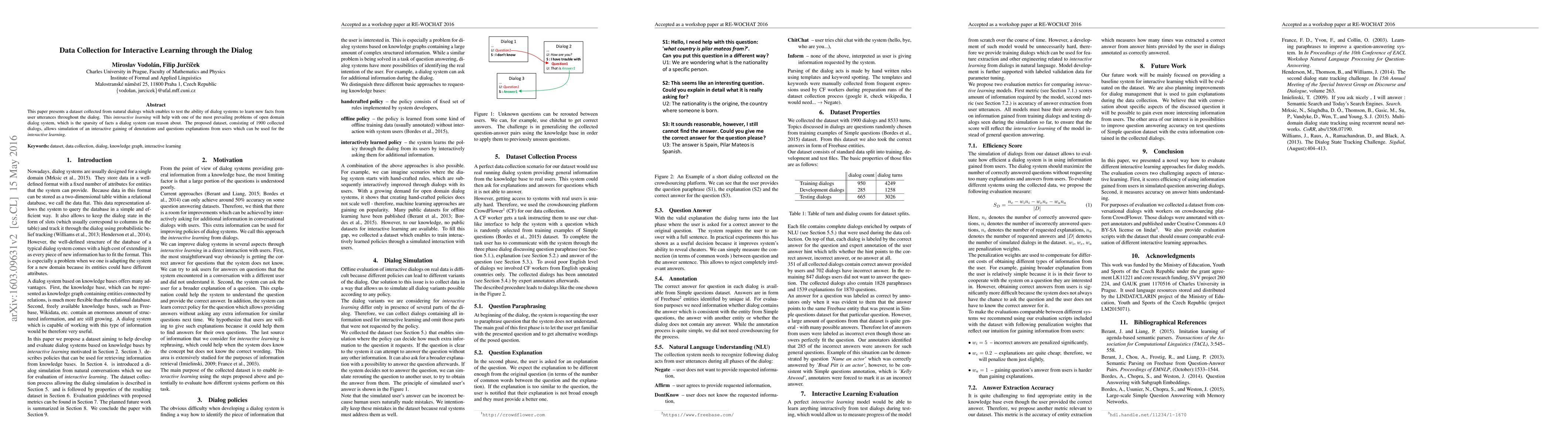 This paper introduces a dataset of 1900 natural dialogs to test interactive learning in dialog systems, aiming to address the sparsity of facts in open domain dialogs by enabling systems to learn new information from user interactions.