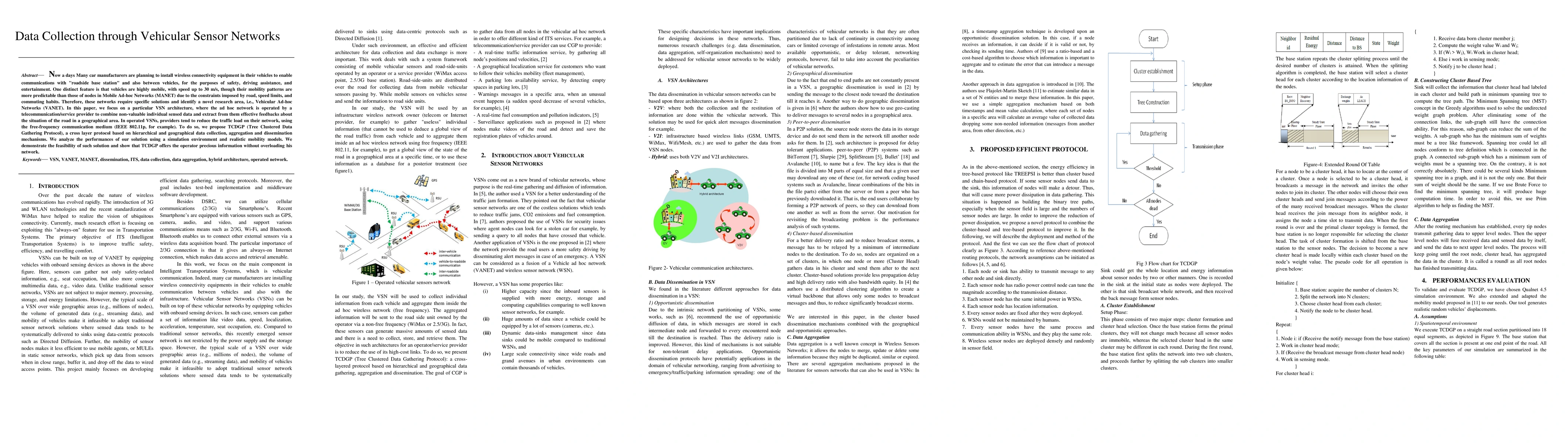 This paper proposes TCDGP, a protocol for vehicular sensor networks (VSNs) to efficiently collect and aggregate data from vehicles for road situation feedback. The protocol leverages hierarchical and geographical data collection mechanisms to reduce traffic load on the network, demonstrating feasibility through simulations.