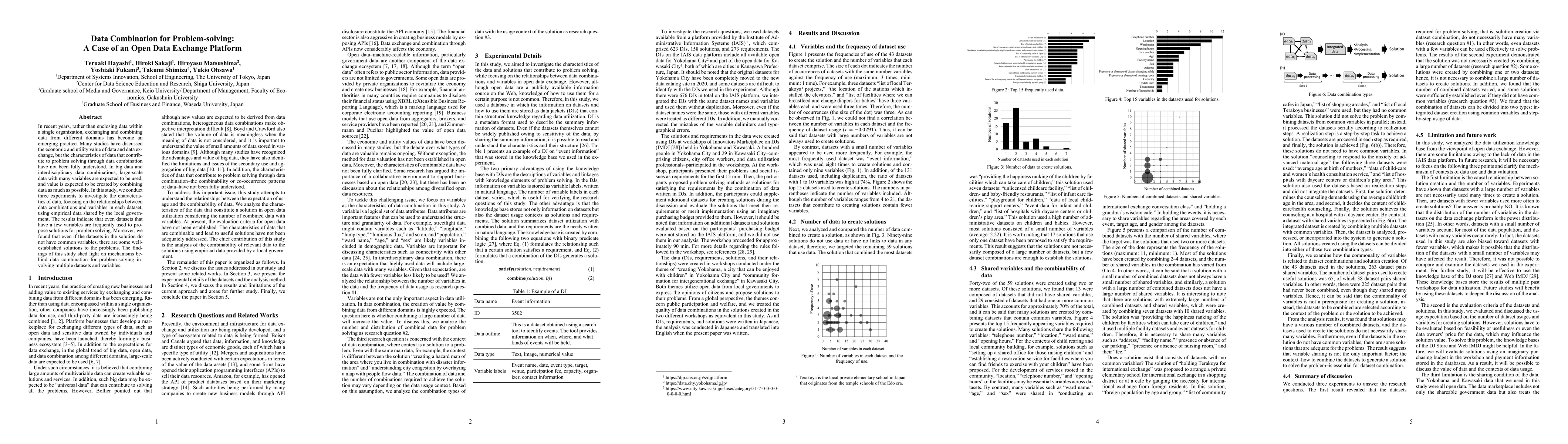 In recent years, rather than enclosing data within a single organization, exchanging and combining data from different domains has become an emerging practice. Many studies have discussed the economic and utility value of data and data exchange, but the characteristics of data that contribute to problem solving through data combination have not been fully understood. In big data and interdisciplinary data combinations, large-scale data with many variables are expected to be used, and value is expected to be created by combining data as much as possible. In this study, we conduct three experiments to investigate the characteristics of data, focusing on the relationships between data combinations and variables in each dataset, using empirical data shared by the local government. The results indicate that even datasets that have a few variables are frequently used to propose solutions for problem solving. Moreover, we found that even if the datasets in the solution do not have common variables, there are some well-established solutions to the problems. The findings of this study shed light on mechanisms behind data combination for problem-solving involving multiple datasets and variables.