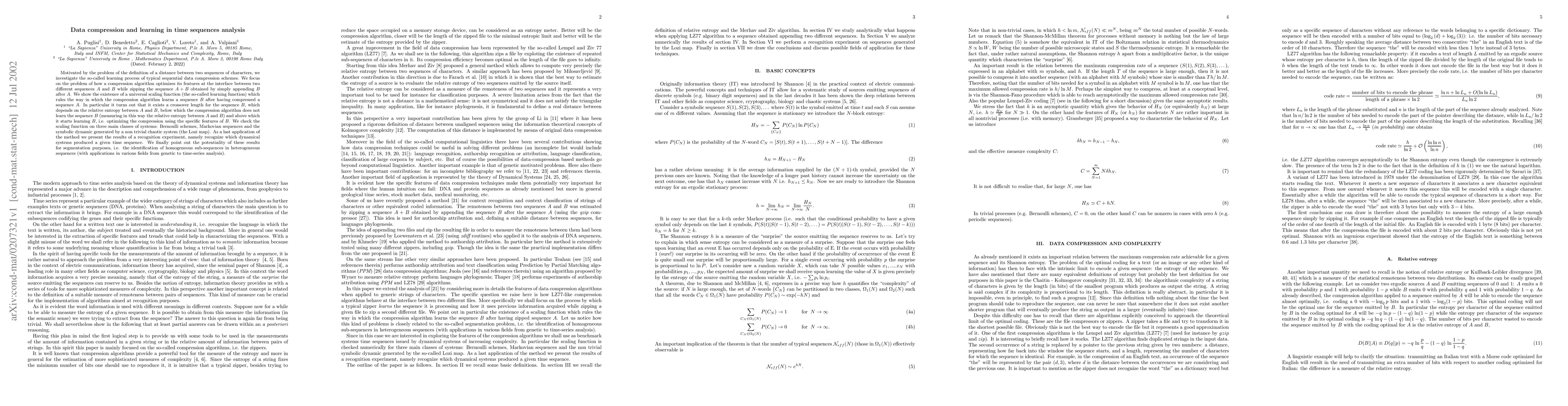 Motivated by the problem of the definition of a distance between two sequences of characters, we investigate the so-called learning process of typical sequential data compression schemes. We focus on the problem of how a compression algorithm optimizes its features at the interface between two different sequences $A$ and $B$ while zipping the sequence $A+B$ obtained by simply appending $B$ after $A$. We show the existence of a universal scaling function (the so-called learning function) which rules the way in which the compression algorithm learns a sequence $B$ after having compressed a sequence $A$. In particular it turns out that it exists a crossover length for the sequence $B$, which depends on the relative entropy between $A$ and $B$, below which the compression algorithm does not learn the sequence $B$ (measuring in this way the relative entropy between $A$ and $B$) and above which it starts learning $B$, i.e. optimizing the compression using the specific features of $B$. We check the scaling function on three main classes of systems: Bernoulli schemes, Markovian sequences and the symbolic dynamic generated by a non trivial chaotic system (the Lozi map). As a last application of the method we present the results of a recognition experiment, namely recognize which dynamical systems produced a given time sequence. We finally point out the potentiality of these results for segmentation purposes, i.e. the identification of homogeneous sub-sequences in heterogeneous sequences (with applications in various fields from genetic to time-series analysis).