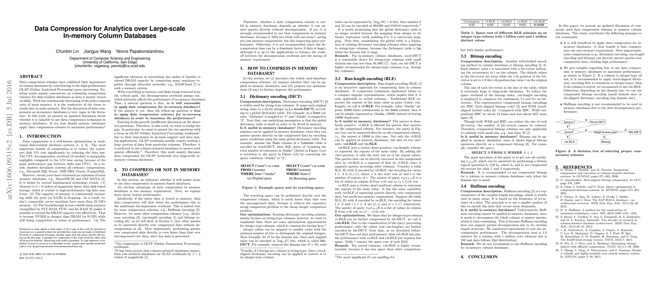 This paper examines the application of data compression techniques in large-scale in-memory column databases to enhance OLAP query processing performance, addressing the gap in literature on this topic and proposing strategies to maximize benefits.