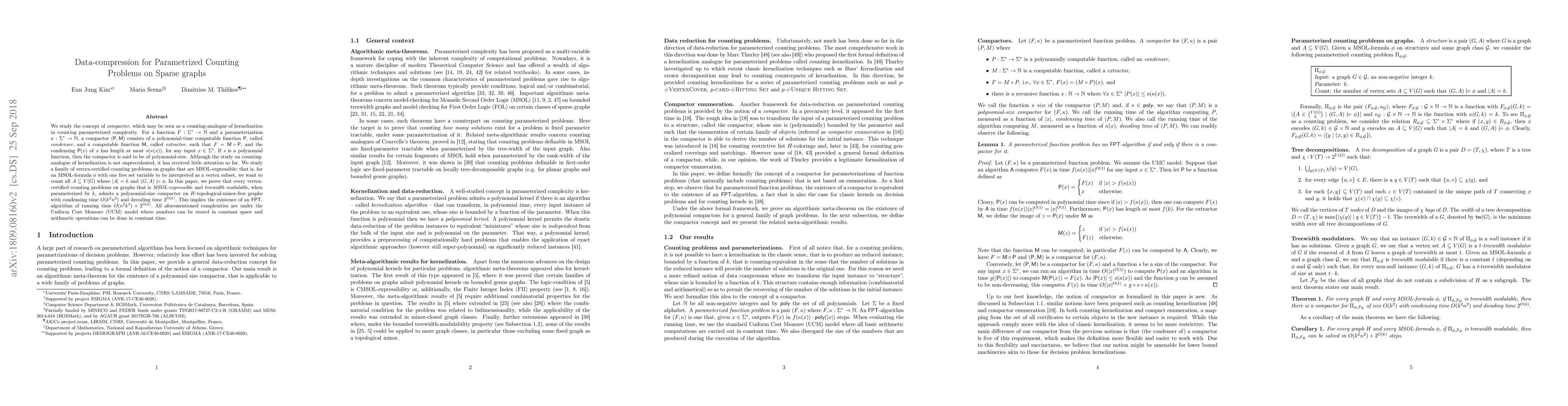 This paper introduces the concept of a "compactor" for parametrized counting problems on sparse graphs, analogous to kernelization in parameterized complexity. It proves that MSOL-expressible vertex-certified counting problems on graphs with treewidth modulability, when parameterized by $k$, admit a polynomial-size compactor on $H$-topological-minor-free graphs, leading to an FPT-algorithm with a running time of $O(n^2k^2)+2^{O(k)}$.