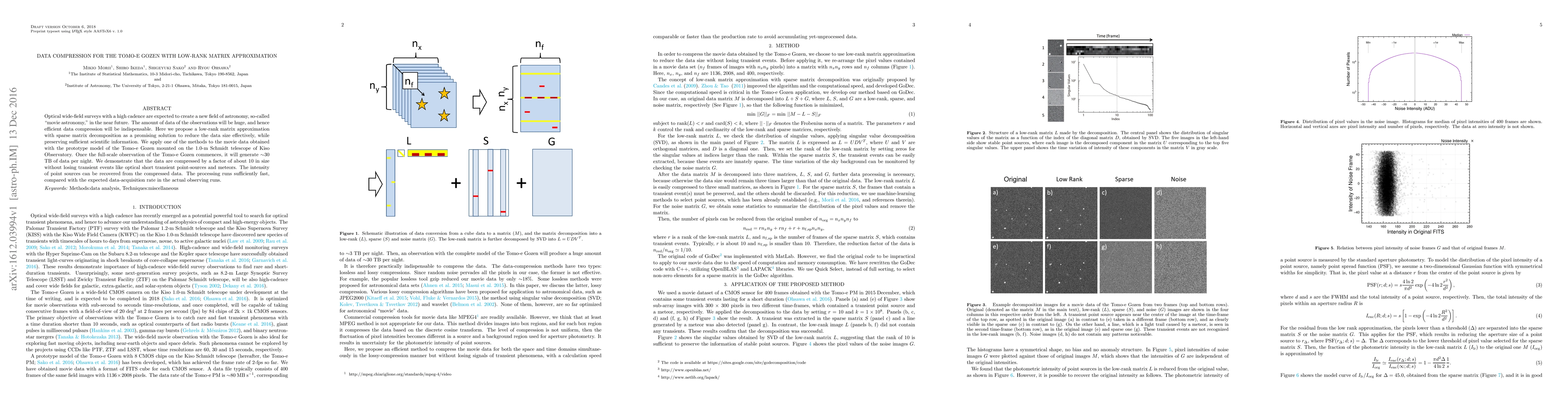 This paper proposes low-rank matrix approximation for efficient data compression in "movie astronomy," specifically applied to the Tomo-e Gozen telescope. The method compresses data by a factor of 10 while preserving transient events and point source intensity, ensuring fast processing for real-time observations.