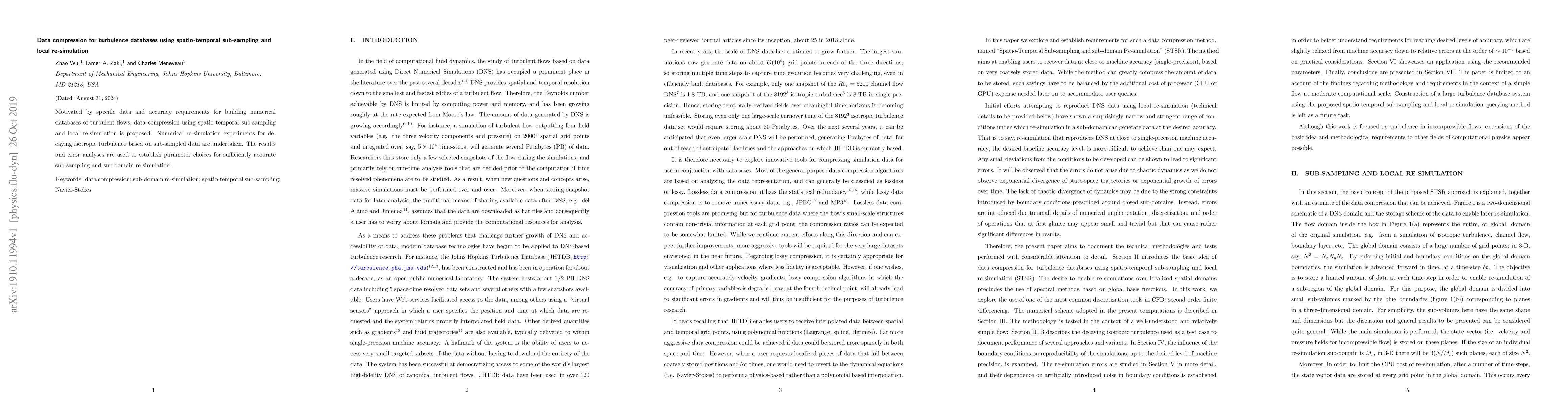 Researchers propose a data compression method for turbulent flow databases using sub-sampling and local re-simulation to reduce storage requirements while maintaining accuracy. The study finds suitable parameter choices for efficient compression and re-simulation of decaying isotropic turbulence data.