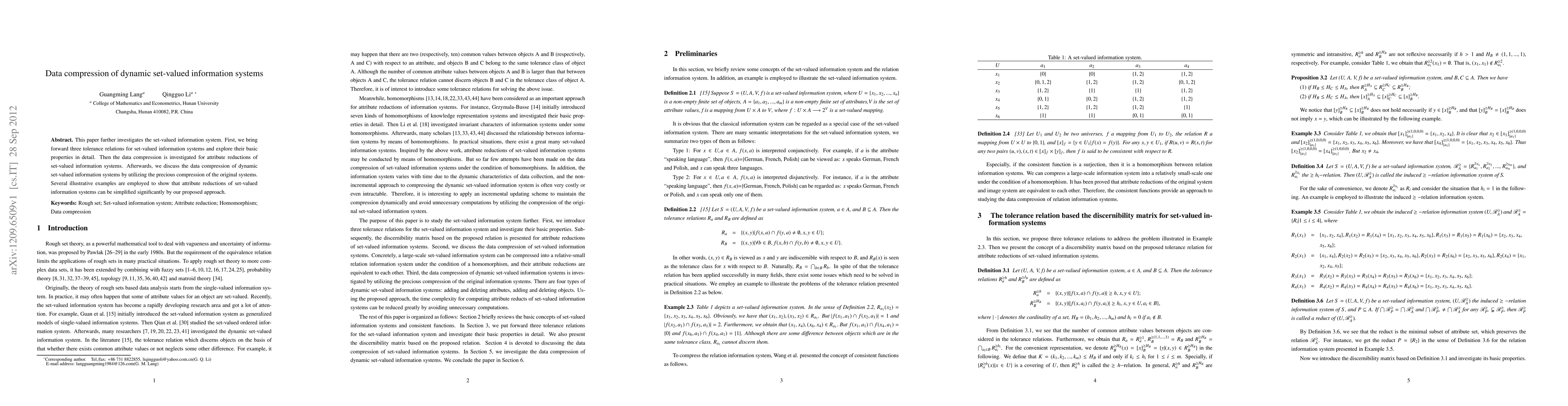 This paper proposes three tolerance relations for set-valued information systems and explores their properties. It investigates data compression techniques for attribute reductions, significantly simplifying reductions through dynamic set-valued information systems.