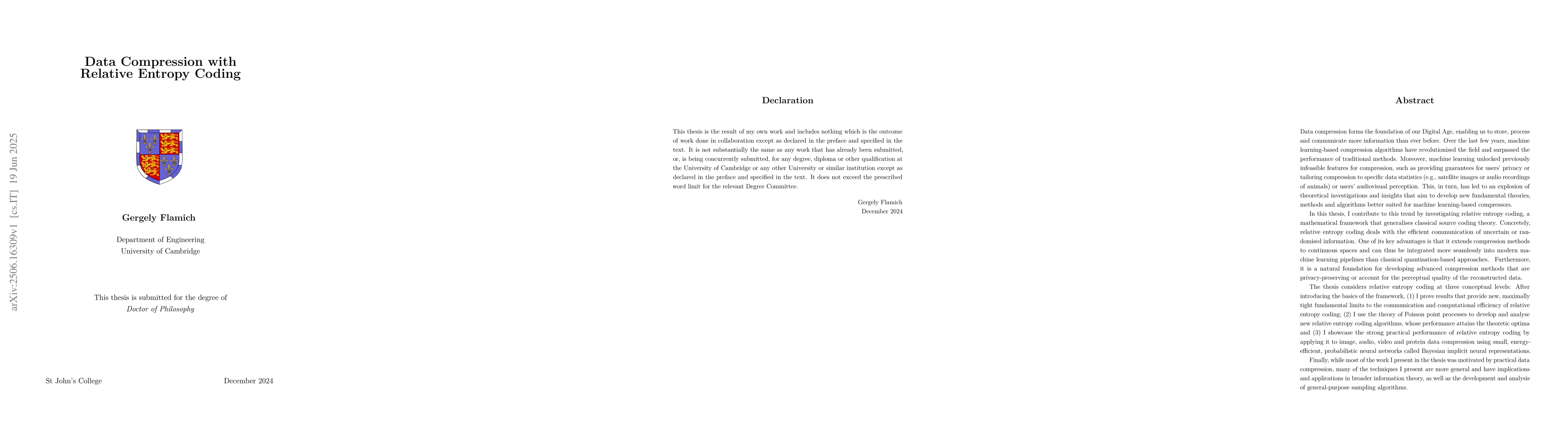Over the last few years, machine learning unlocked previously infeasible features for compression, such as providing guarantees for users' privacy or tailoring compression to specific data statistics (e.g., satellite images or audio recordings of animals) or users' audiovisual perception. This, in turn, has led to an explosion of theoretical investigations and insights that aim to develop new fundamental theories, methods and algorithms better suited for machine learning-based compressors. In this thesis, I contribute to this trend by investigating relative entropy coding, a mathematical framework that generalises classical source coding theory. Concretely, relative entropy coding deals with the efficient communication of uncertain or randomised information. One of its key advantages is that it extends compression methods to continuous spaces and can thus be integrated more seamlessly into modern machine learning pipelines than classical quantisation-based approaches. Furthermore, it is a natural foundation for developing advanced compression methods that are privacy-preserving or account for the perceptual quality of the reconstructed data. The thesis considers relative entropy coding at three conceptual levels: After introducing the basics of the framework, (1) I prove results that provide new, maximally tight fundamental limits to the communication and computational efficiency of relative entropy coding; (2) I use the theory of Poisson point processes to develop and analyse new relative entropy coding algorithms, whose performance attains the theoretic optima and (3) I showcase the strong practical performance of relative entropy coding by applying it to image, audio, video and protein data compression using small, energy-efficient, probabilistic neural networks called Bayesian implicit neural representations.
