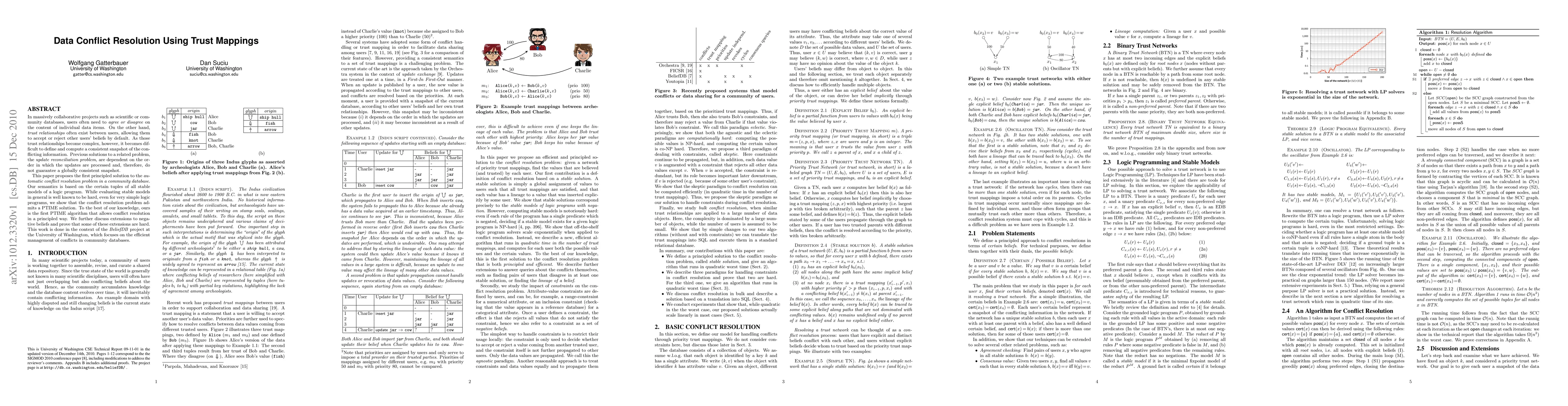 This paper proposes a PTIME algorithm for resolving data conflicts in collaborative databases by leveraging trust relationships among users, offering a principled solution that avoids dependency on update order. The approach is based on stable models of logic programs, extending to handle negative beliefs, though some extensions are computationally hard.