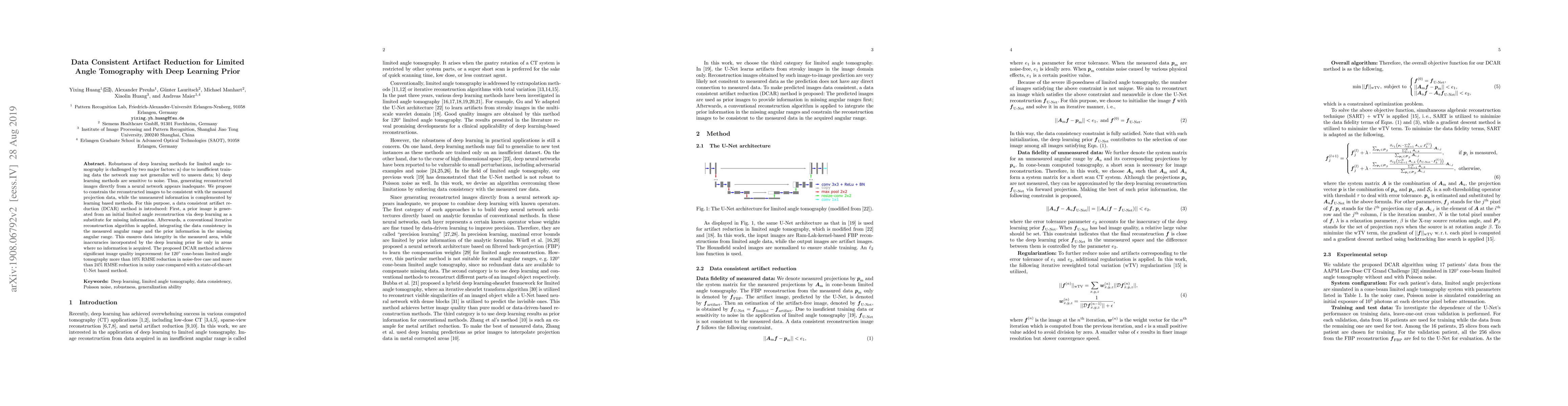 The paper proposes a Data Consistent Artifact Reduction (DCAR) method to enhance limited angle tomography using deep learning. It combines a deep learning prior with conventional iterative reconstruction to improve image quality, achieving over 10% RMSE reduction in noise-free and 24% in noisy cases compared to U-Net based methods.