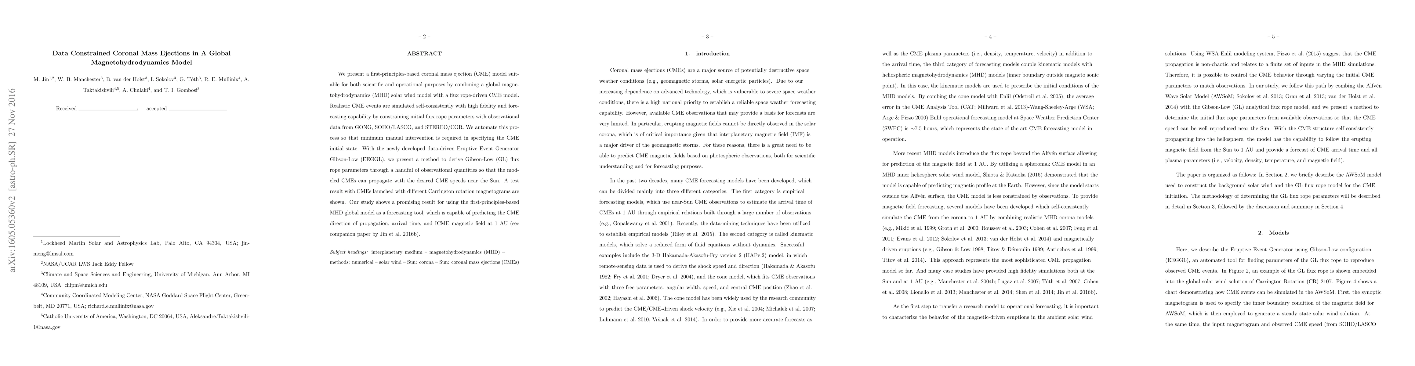 We present a first-principles-based coronal mass ejection (CME) model suitable for both scientific and operational purposes by combining a global magnetohydrodynamics (MHD) solar wind model with a flux rope-driven CME model. Realistic CME events are simulated self-consistently with high fidelity and forecasting capability by constraining initial flux rope parameters with observational data from GONG, SOHO/LASCO, and STEREO/COR. We automate this process so that minimum manual intervention is required in specifying the CME initial state. With the newly developed data-driven Eruptive Event Generator Gibson-Low (EEGGL), we present a method to derive Gibson-Low (GL) flux rope parameters through a handful of observational quantities so that the modeled CMEs can propagate with the desired CME speeds near the Sun. A test result with CMEs launched with different Carrington rotation magnetograms are shown. Our study shows a promising result for using the first-principles-based MHD global model as a forecasting tool, which is capable of predicting the CME direction of propagation, arrival time, and ICME magnetic field at 1 AU (see companion paper by Jin et al. 2016b).