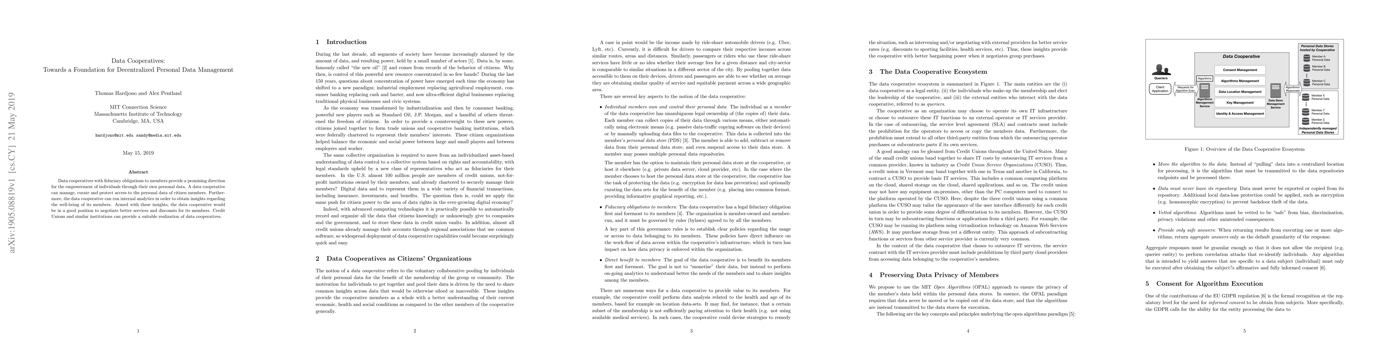 Data cooperatives with fiduciary obligations to members provide a promising direction for the empowerment of individuals through their own personal data. A data cooperative can manage, curate and protect access to the personal data of citizen members. Furthermore, the data cooperative can run internal analytics in order to obtain insights regarding the well-being of its members. Armed with these insights, the data cooperative would be in a good position to negotiate better services and discounts for its members. Credit Unions and similar institutions can provide a suitable realization of data cooperatives.