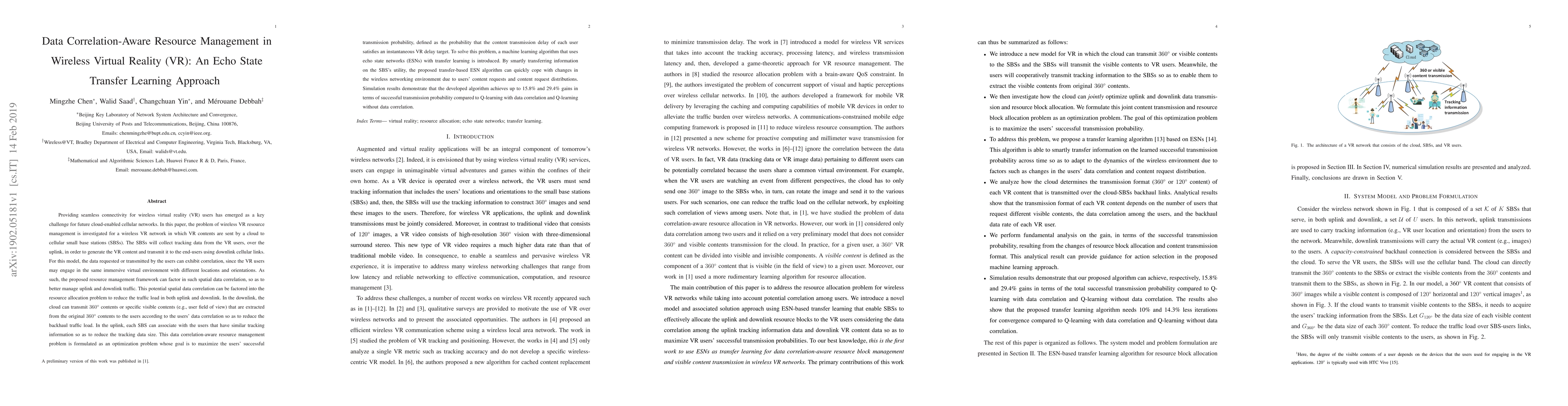 This paper proposes a data correlation-aware resource management framework for wireless VR networks using an echo state network-based transfer learning approach. The framework optimizes uplink and downlink traffic by considering spatial data correlation among users to reduce traffic load and improve transmission probability.