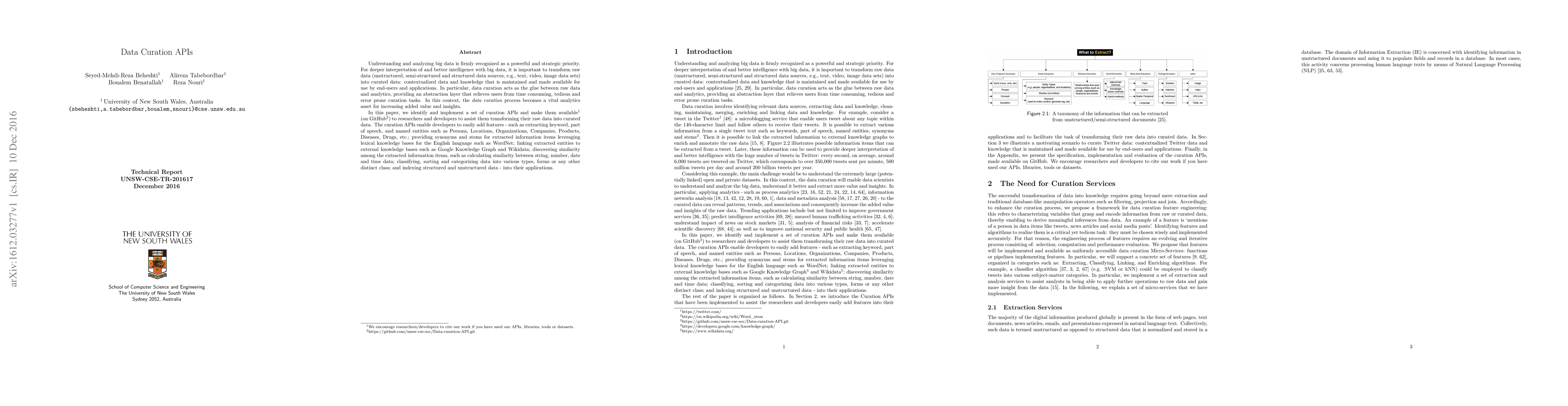 Understanding and analyzing big data is firmly recognized as a powerful and strategic priority. For deeper interpretation of and better intelligence with big data, it is important to transform raw data (unstructured, semi-structured and structured data sources, e.g., text, video, image data sets) into curated data: contextualized data and knowledge that is maintained and made available for use by end-users and applications. In particular, data curation acts as the glue between raw data and analytics, providing an abstraction layer that relieves users from time consuming, tedious and error prone curation tasks. In this context, the data curation process becomes a vital analytics asset for increasing added value and insights. In this paper, we identify and implement a set of curation APIs and make them available (on GitHub) to researchers and developers to assist them transforming their raw data into curated data. The curation APIs enable developers to easily add features - such as extracting keyword, part of speech, and named entities such as Persons, Locations, Organizations, Companies, Products, Diseases, Drugs, etc.; providing synonyms and stems for extracted information items leveraging lexical knowledge bases for the English language such as WordNet; linking extracted entities to external knowledge bases such as Google Knowledge Graph and Wikidata; discovering similarity among the extracted information items, such as calculating similarity between string, number, date and time data; classifying, sorting and categorizing data into various types, forms or any other distinct class; and indexing structured and unstructured data - into their applications.