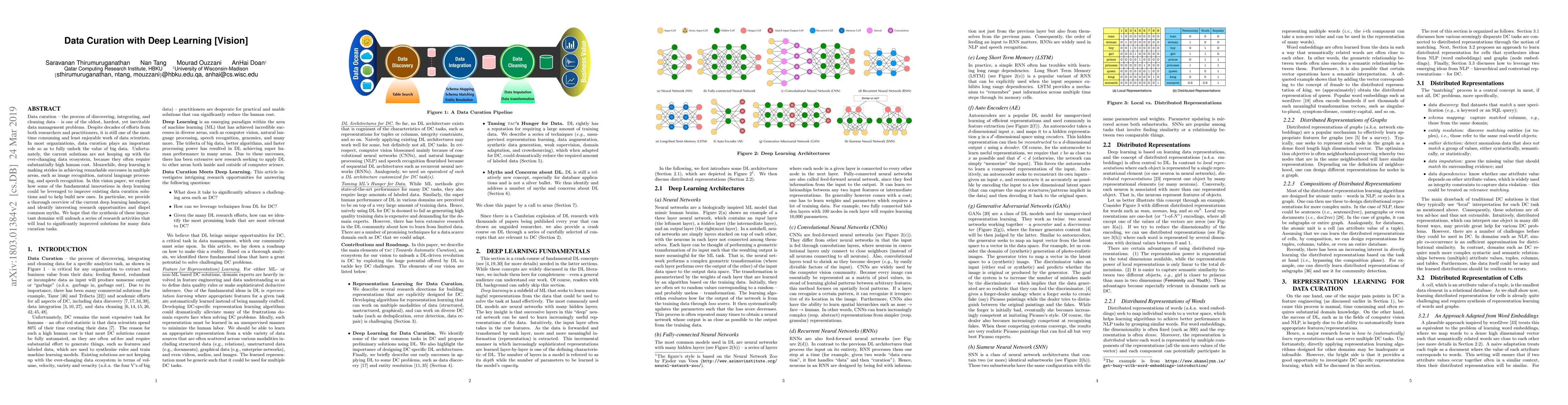 Data curation - the process of discovering, integrating, and cleaning data - is one of the oldest, hardest, yet inevitable data management problems. Despite decades of efforts from both researchers and practitioners, it is still one of the most time consuming and least enjoyable work of data scientists. In most organizations, data curation plays an important role so as to fully unlock the value of big data. Unfortunately, the current solutions are not keeping up with the ever-changing data ecosystem, because they often require substantially high human cost. Meanwhile, deep learning is making strides in achieving remarkable successes in multiple areas, such as image recognition, natural language processing, and speech recognition. In this vision paper, we explore how some of the fundamental innovations in deep learning could be leveraged to improve existing data curation solutions and to help build new ones. In particular, we provide a thorough overview of the current deep learning landscape, and identify interesting research opportunities and dispel common myths. We hope that the synthesis of these important domains will unleash a series of research activities that will lead to significantly improved solutions for many data curation tasks.