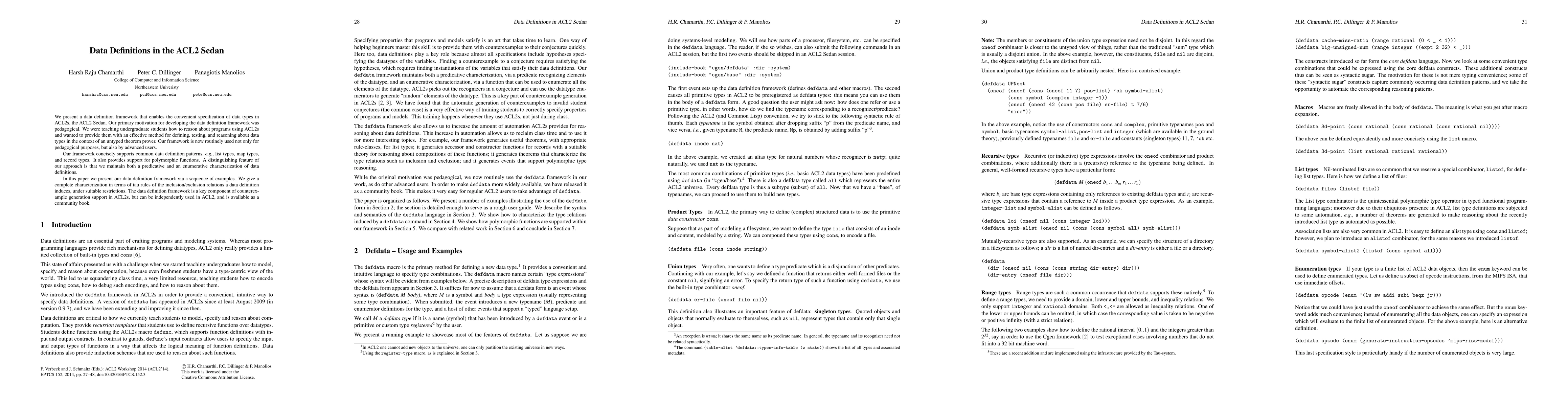 The research presents a data definition framework for ACL2s, the ACL2 Sedan, designed for teaching undergraduate students how to reason about programs. The framework supports common data definition patterns like list, map, and record types, and maintains both predicative and enumerative characterizations.
