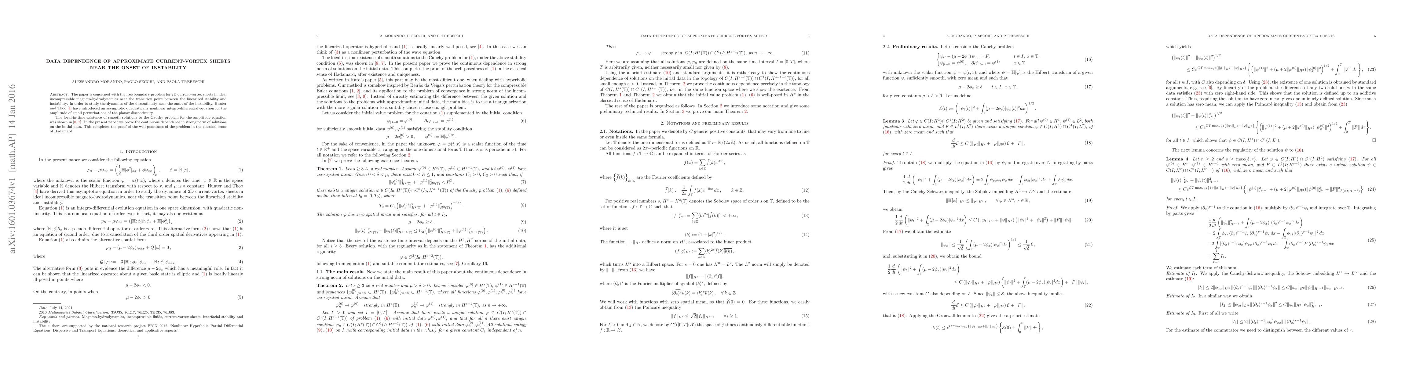 The paper is concerned with the free boundary problem for 2D current-vortex sheets in ideal incompressible magneto-hydrodynamics near the transition point between the linearized stability and instability. In order to study the dynamics of the discontinuity near the onset of the instability, Hunter and Thoo have introduced an asymptotic quadratically nonlinear integro-differential equation for the amplitude of small perturbations of the planar discontinuity. The local-in-time existence of smooth solutions to the Cauchy problem for the amplitude equation was already shown. In the present paper we prove the continuous dependence in strong norm of solutions on the initial data. This completes the proof of the well-posedness of the problem in the classical sense of Hadamard.