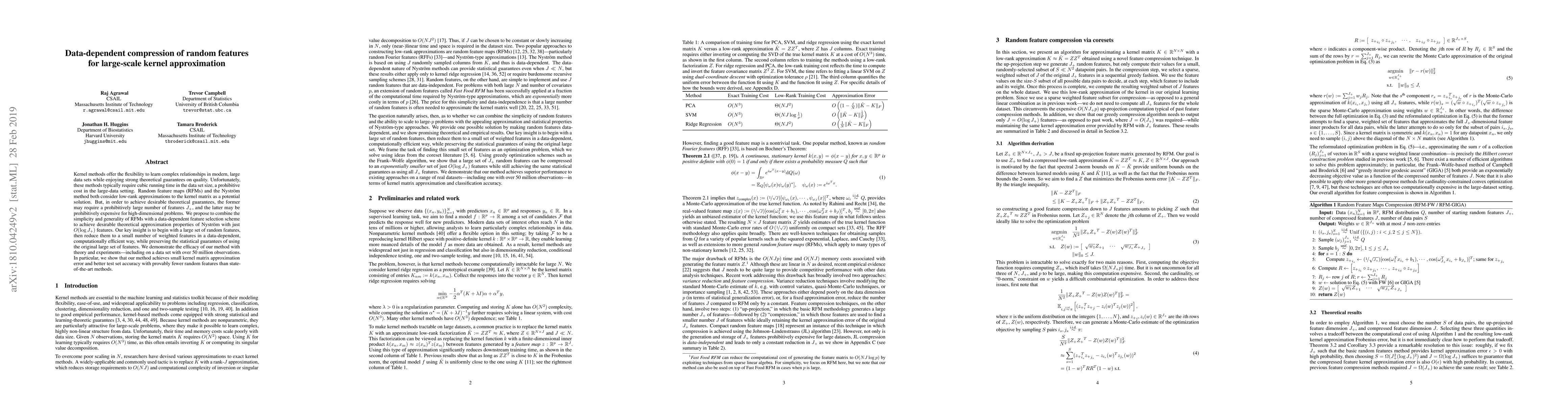 Kernel methods offer the flexibility to learn complex relationships in modern, large data sets while enjoying strong theoretical guarantees on quality. Unfortunately, these methods typically require cubic running time in the data set size, a prohibitive cost in the large-data setting. Random feature maps (RFMs) and the Nystrom method both consider low-rank approximations to the kernel matrix as a potential solution. But, in order to achieve desirable theoretical guarantees, the former may require a prohibitively large number of features J+, and the latter may be prohibitively expensive for high-dimensional problems. We propose to combine the simplicity and generality of RFMs with a data-dependent feature selection scheme to achieve desirable theoretical approximation properties of Nystrom with just O(log J+) features. Our key insight is to begin with a large set of random features, then reduce them to a small number of weighted features in a data-dependent, computationally efficient way, while preserving the statistical guarantees of using the original large set of features. We demonstrate the efficacy of our method with theory and experiments--including on a data set with over 50 million observations. In particular, we show that our method achieves small kernel matrix approximation error and better test set accuracy with provably fewer random features than state-of-the-art methods.