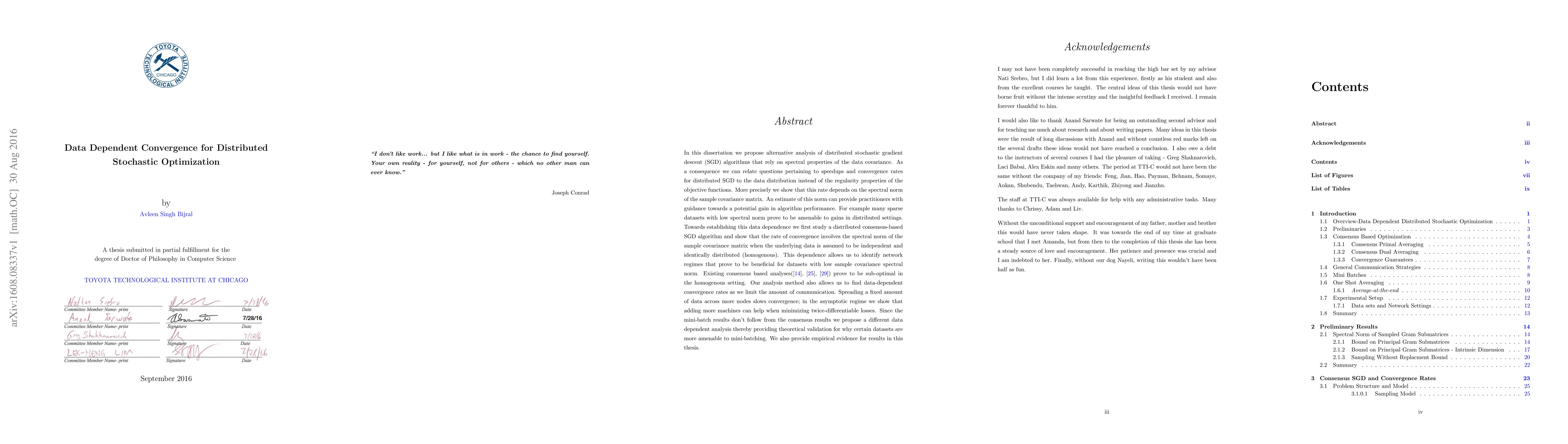 In this dissertation we propose alternative analysis of distributed stochastic gradient descent (SGD) algorithms that rely on spectral properties of the data covariance. As a consequence we can relate questions pertaining to speedups and convergence rates for distributed SGD to the data distribution instead of the regularity properties of the objective functions. More precisely we show that this rate depends on the spectral norm of the sample covariance matrix. An estimate of this norm can provide practitioners with guidance towards a potential gain in algorithm performance. For example many sparse datasets with low spectral norm prove to be amenable to gains in distributed settings. Towards establishing this data dependence we first study a distributed consensus-based SGD algorithm and show that the rate of convergence involves the spectral norm of the sample covariance matrix when the underlying data is assumed to be independent and identically distributed (homogenous). This dependence allows us to identify network regimes that prove to be beneficial for datasets with low sample covariance spectral norm. Existing consensus based analyses prove to be sub-optimal in the homogenous setting. Our analysis method also allows us to find data-dependent convergence rates as we limit the amount of communication. Spreading a fixed amount of data across more nodes slows convergence; in the asymptotic regime we show that adding more machines can help when minimizing twice-differentiable losses. Since the mini-batch results don't follow from the consensus results we propose a different data dependent analysis thereby providing theoretical validation for why certain datasets are more amenable to mini-batching. We also provide empirical evidence for results in this thesis.