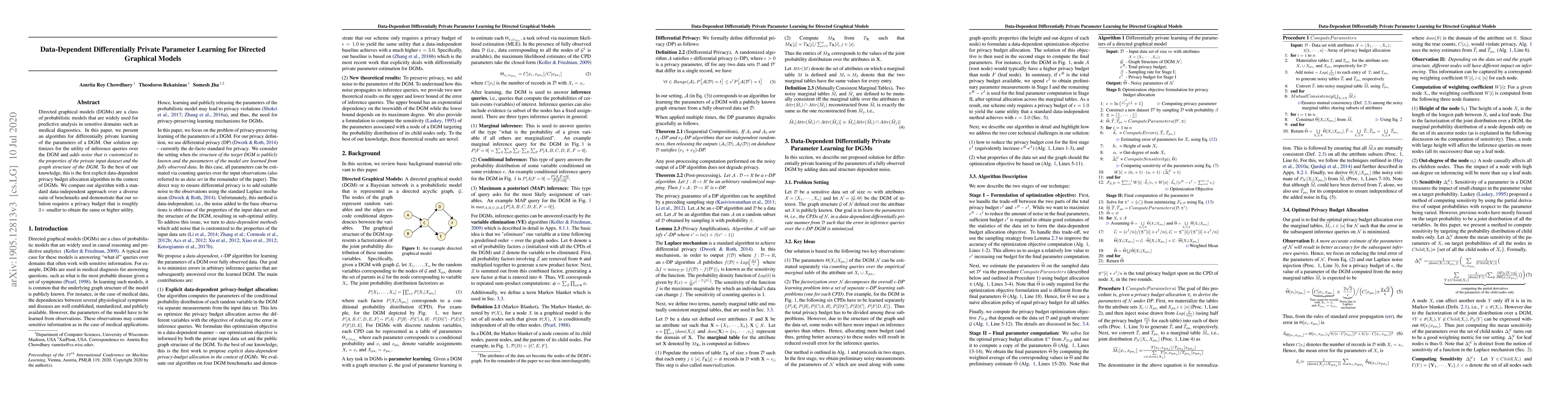 The paper presents an algorithm for differentially private learning of directed graphical models (DGMs) with a known graph structure over fully observed data, optimizing for inference query utility and adding noise customized to the dataset properties and graph structure.
