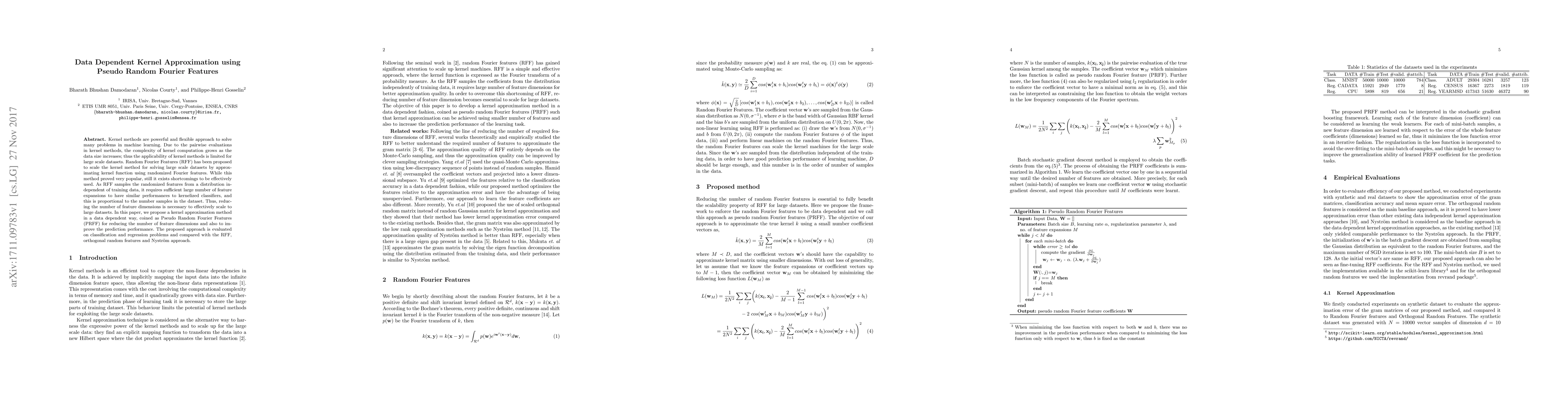 This paper proposes Pseudo Random Fourier Features (PRFF) to scale kernel methods for large datasets by reducing feature dimensions and improving prediction performance through data-dependent kernel approximation, compared against Random Fourier Features, orthogonal random features, and the Nyström approach.